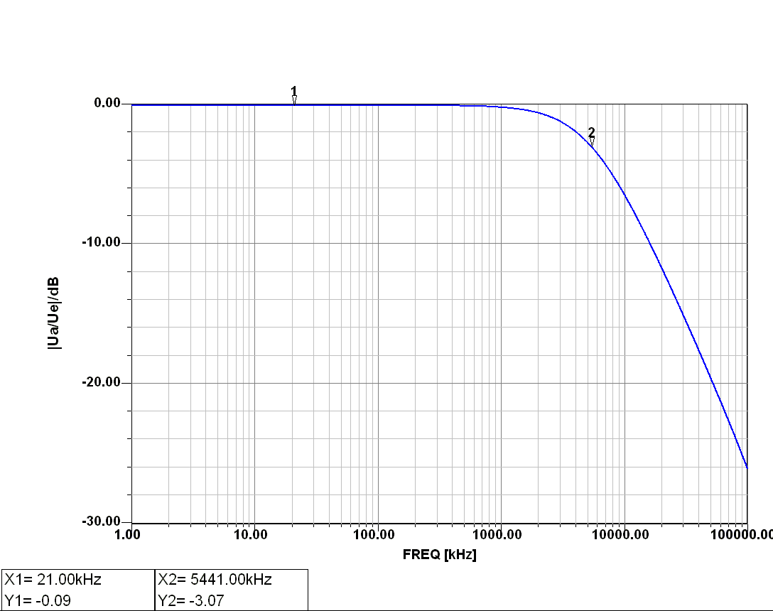 Seine wichtigen Werte: Induktivität 340nH/m, Kapazität 60pF/m; Widerstände sind vernachlässigbar, sorgen eh nur für einen minimalen Pegelabfall. Ich habe ein 1m langes Kabel simuliert, die Quelle hat einen Ausgangswiderstand von 500Ohm, die Senke (z. B. der Verstärker) einen Eingangswiderstand von 47kOhm (sind typische Werte, die jedes einigermaßen vernünftig konstruiertes Gerät unterbieten (die 500Ohm) bzw. überbieten (die 47kOhm) sollte.