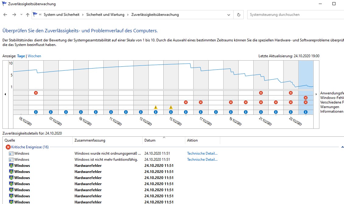 "Das System wurde zuvor am 22.10.2020 um 13:38:04 unerwartet heruntergefahren." Das wird wohl die Zeit gewesen sein, wo er in den Energiesparmodus gegangen ist.