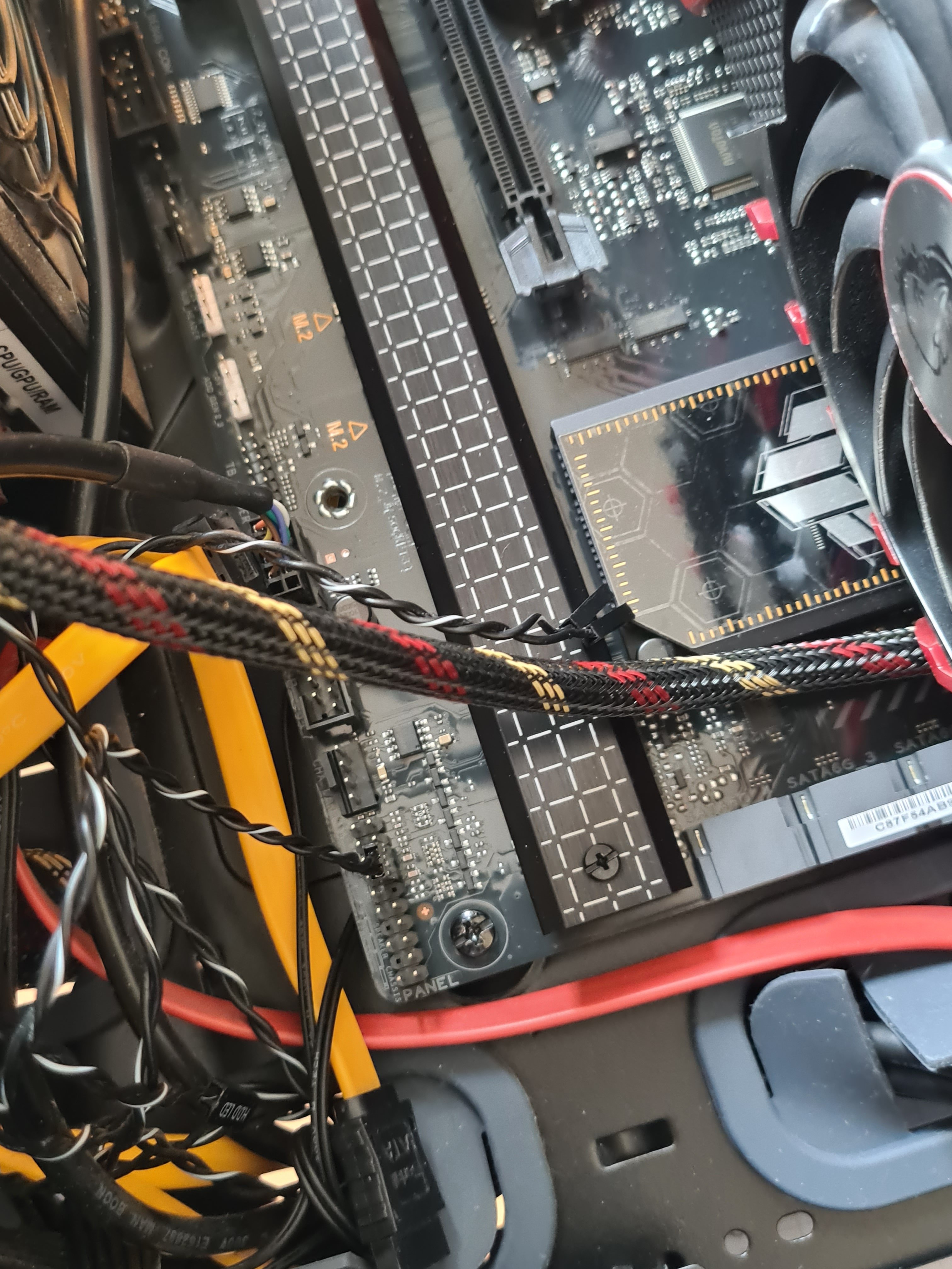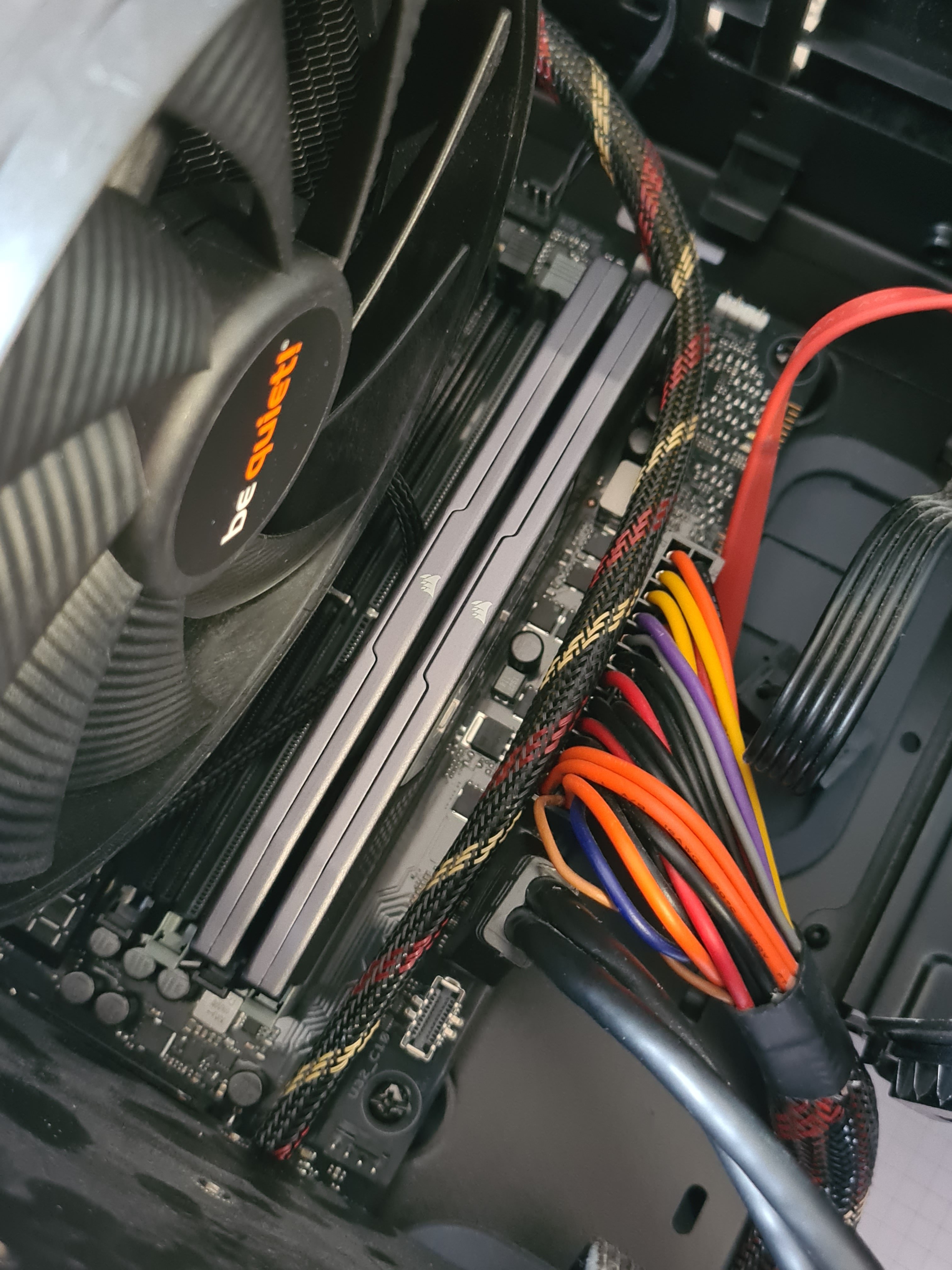 Ist der CPU-Lüfter angeschlossen? Auf dem Bild befindet sich neben dem CPU-Kühler ein freier 4-Pin Sockel.