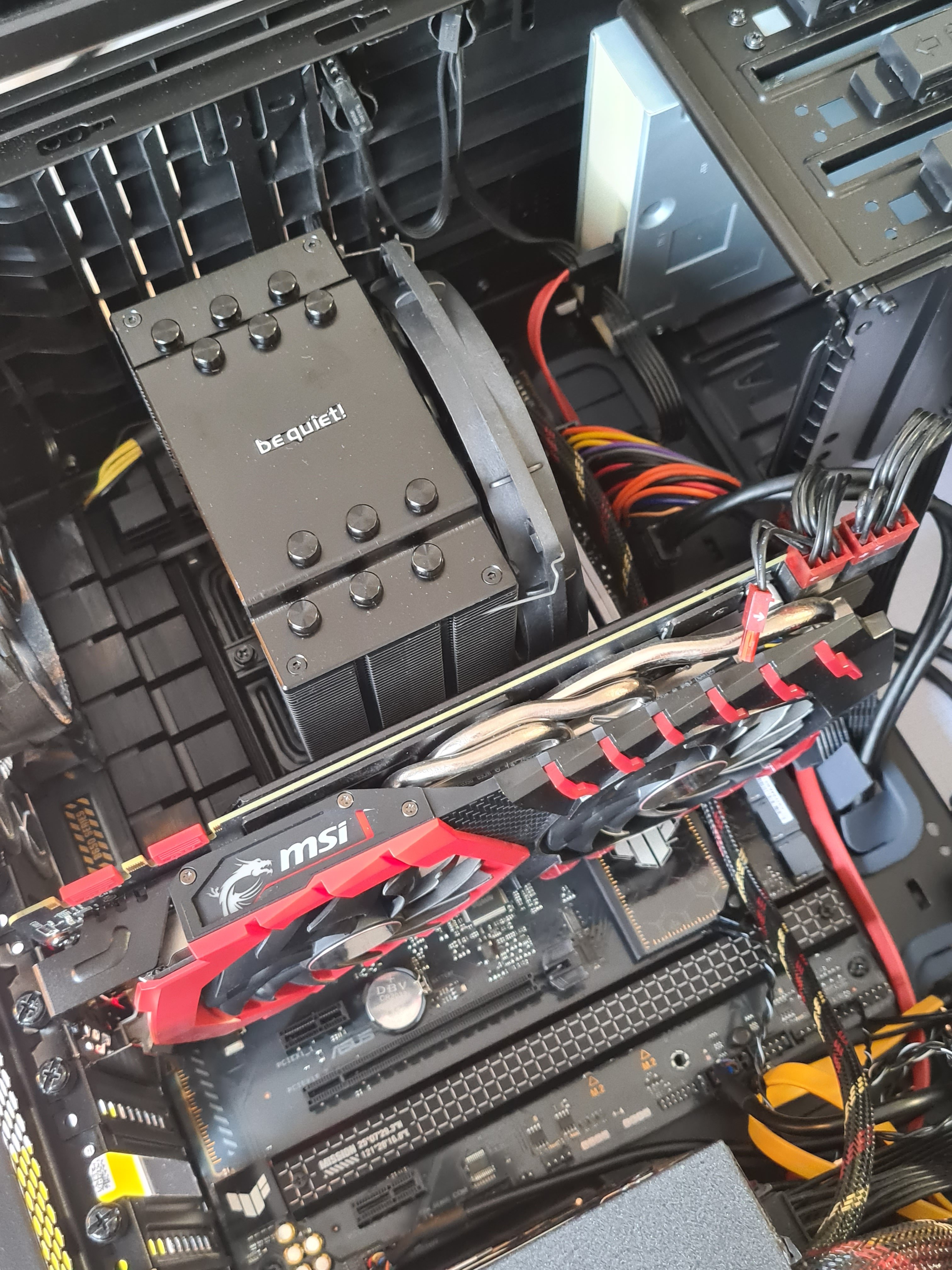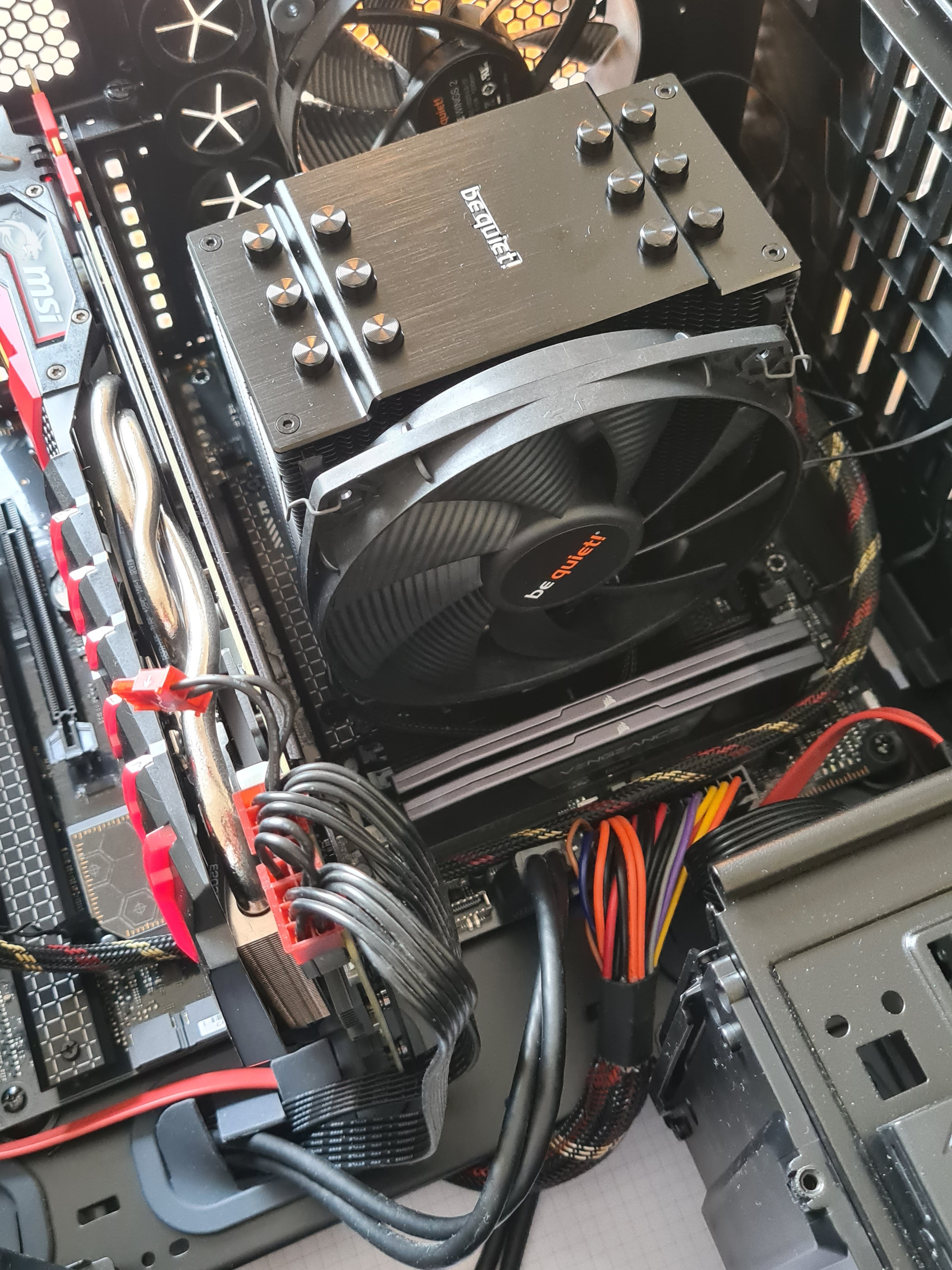 Was ich noch gesehen hab, wenn das System mal laufen sollte, der hintere Gehäuselüfter ist verkehrt eingebaut.