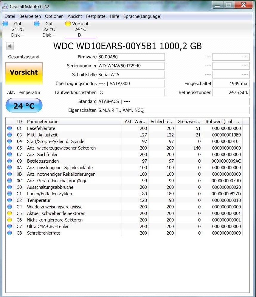 "Intel Rapid Storage Technologie" meldet ein Problem mit einer meiner Festplatten (Raid 0, Anschluss 0): Status "Gefährdet". Beim Booten wird zudem "SMART EVENT (0)" angezeigt. Ich habe die Festplatte mit dem Programm auf "Normal" zurückgesetzt und meine Daten gesichert. Eine neue Festplatte sollte ich mir aber wahscheinlich doch besser zulegen (?), vor allem weil auch Crystal Diskm Info Probleme anzeigt (siehe Bild)