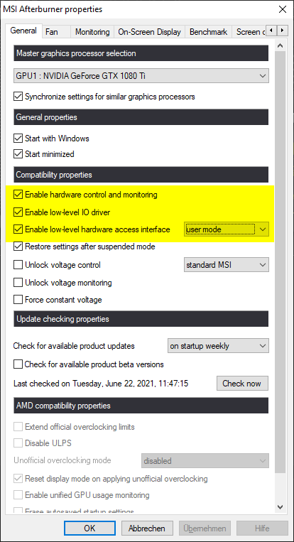 ja, MSI Afterburn ist installiert. Die Einstellung "Enable low-level hardware access interface" ist aktiv und auf "user mode" eingestellt. Das ist aber eine Standardeinstellung, die hab ich nicht geändert.