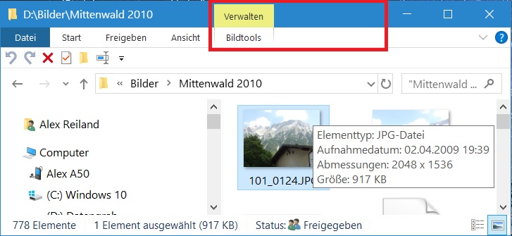 Irrtum! Neben dem Punkt "Bildtools" (bzw. auch anderen Menüpunkten) tauchen keine Ordnernamen auf. Da tauchen nur Punkte auf, wenn es eine entsprechende Erweiterung gibt, die hier weitere Möglichkeiten (z.B. zur Verwaltung der Templates) einblenden. Es ist ausserdem auch die Anzeige der Menüpunkte vertauscht - denn "Bildtools" müsste unterhalb von "Verwalten" in der Ribbonleiste stehen.