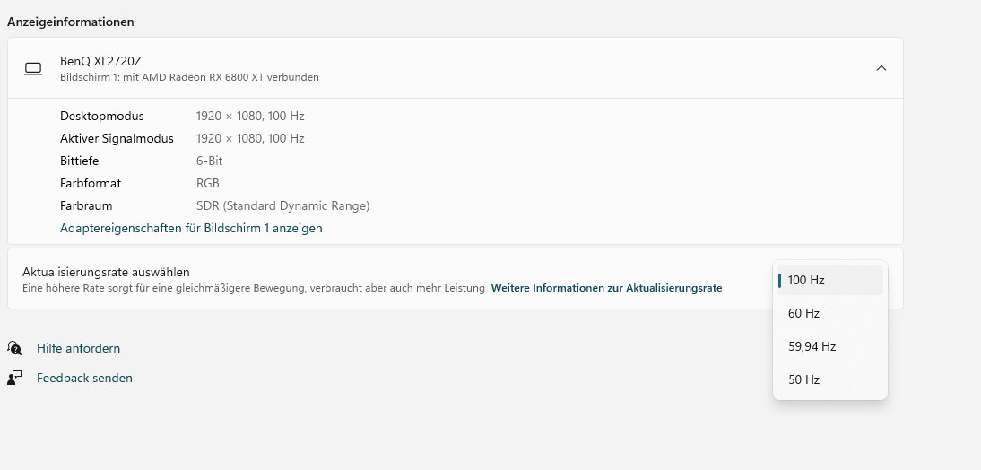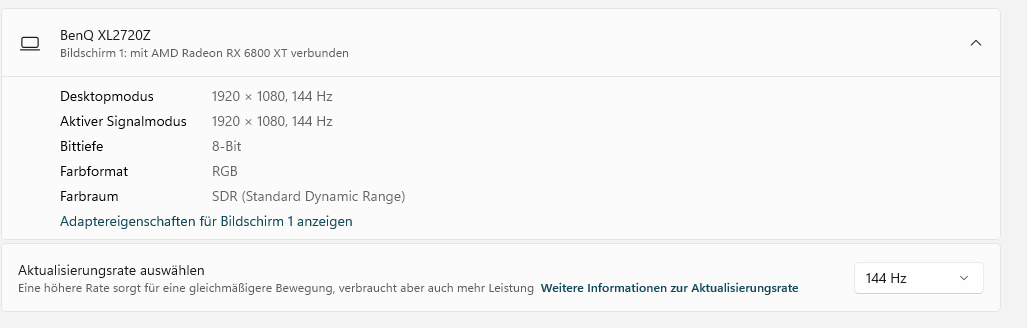 Bereits nach der Inbetriebnahme der neuen Grafikkarte konnte ich den Monitor nur auf max. 100Hz stellen (siehe Anhang). Der Monitor kann 144Hz. Lösen konnte ich das Problem nur als ich den Grafikkarten Treiber im Gerätemanager nochmals deinstalliert hatte. Seit dem waren auch die 144Hz anwählbar und alles war ok. Heute gab es dann ein AMD Adrenalin Update. Nach dem Update war der Monitor wieder auf 100Hz eingestellt und ich konnte auch nicht höher. Also wieder den Grafikkarten Treiber im Gerätemanager deinstalliert, was wieder erfolgreich war. Monitor ist per DP angeschlossen. Was mache ich falsch?