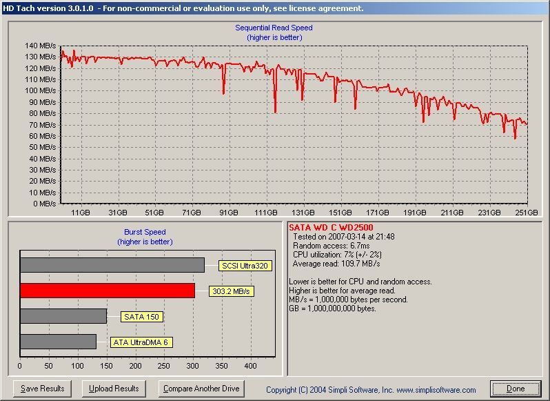 Woran stellt ihr das fest? An der Höhe der sequenziellen Transferrate, die man mit HD-Tach messen kann? Dann lasst euch mal sagen, dass die gar nicht so entscheidend ist, wie ihr vielleicht annehmt. Die sequenzielle Transferrate gehört zwar zu den wichtigen Eckdaten, alleine betrachtet sagt sie aber so gut wie nichts über die Leistung einer Festplatten unter Praxisbedingungen aus. Hier kommt es auf das Zusammenspiel der mittleren Zugriffszeit, der Cache-Algorithmen und der sequenziellen Transferrate an. Je nach Anwendungsgebiet und Zugriffsmuster hat mal die Zugriffszeit und die Cache-Algorithmen und mal die sequenzielle Transferrate mehr Gewicht. In der Praxis überwiegen allerdings Random Zugriffe was bedeutet, dass die sequenzielle Transferrate wenig Einfluss auf die Leistung hat. Schließlich liegen die Daten, die gelesen werden, äußerst selten direkt hintereinander, selbst wenn die Festplatte perfekt defragmentiert ist.