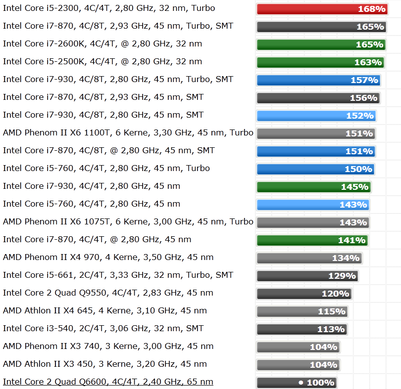In den meisten Fällen ist das sehr wohl wahr, allerdings bin ich mir nicht so sicher, ob ein altes Spiel wie der FS9, mit den neuen Befehlssätzen eines i5 überhaupt was anfangen kann. Ein FSX profitiert davon ganz bestimmt, da würde der Vergleich für die Q6600 vermutlich ziemlich schlecht ausfallen.