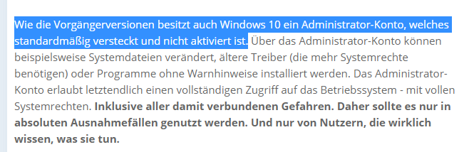 Und das ist genau die Art a Information, die zwar faktisch richtig ist. Bei so einer Anfrage aber eher Probleme verursacht.Ponderosa schrieb:Vielleicht sollte mal jemand sagen, dass das Adminkonto bei Win 10 PC Welt - versteckt und nicht aktiviert ist