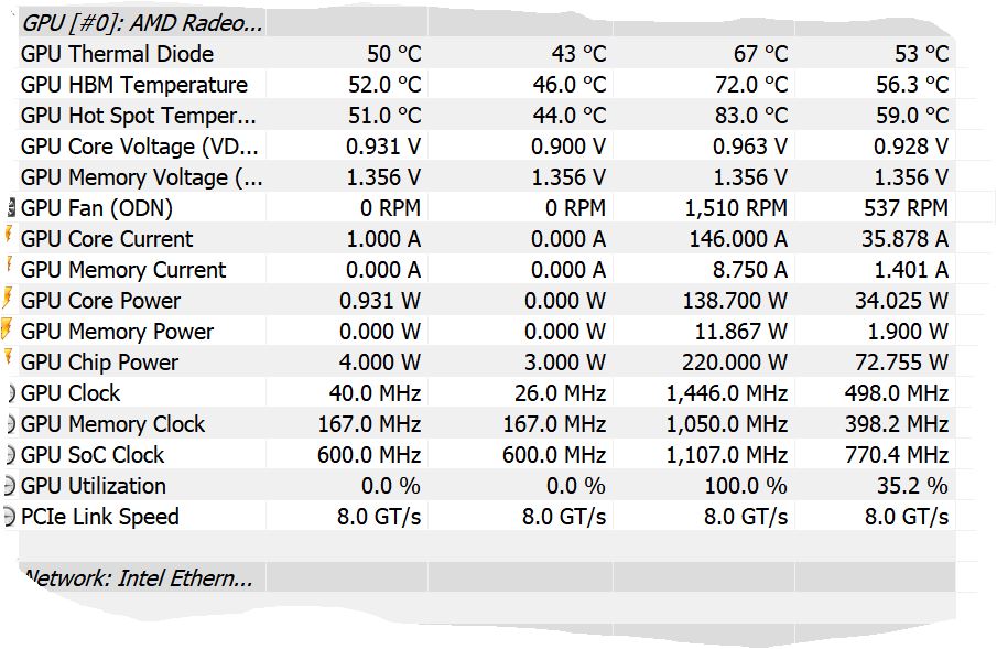 bei hwinfo gpu max.63° und hbm72° und hotspot77°,,,gpu clock 1259Mhz hbm clock 945Mhz.