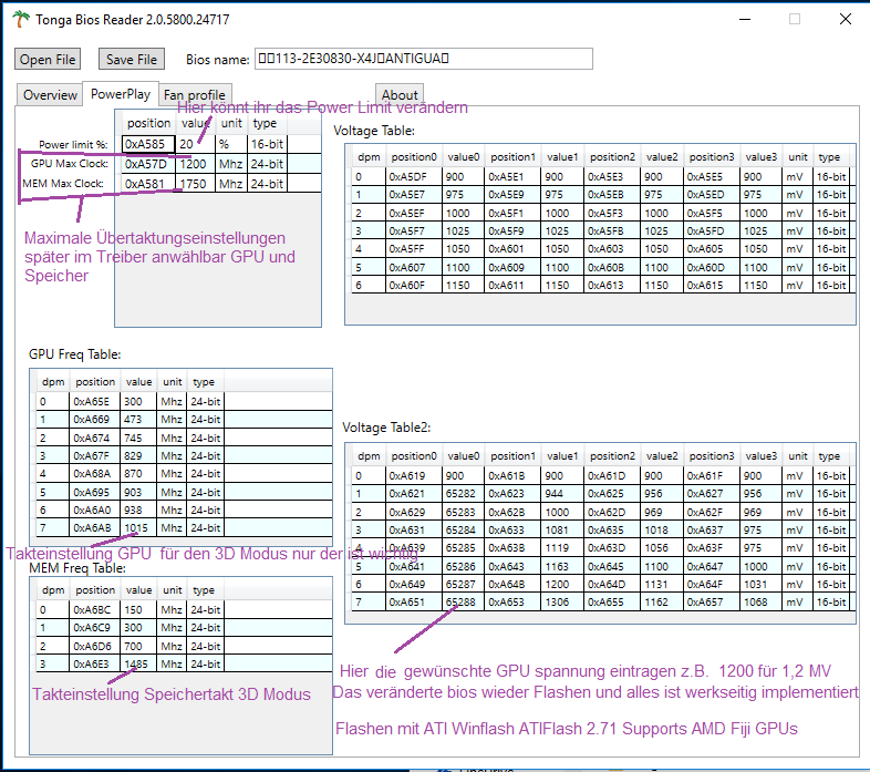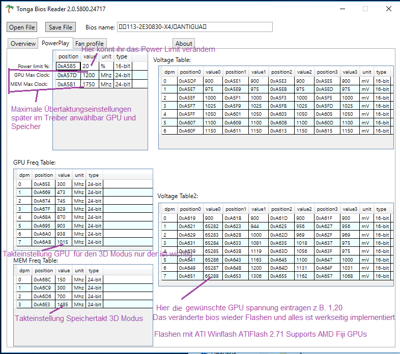 Zwar was älter, aber hiermit kann man das Bios editieren, mit de VBE7 geht das bei den neuen Karten derzeit nicht, vielleicht kommt ja mal ein neuer Bios Editior raus.