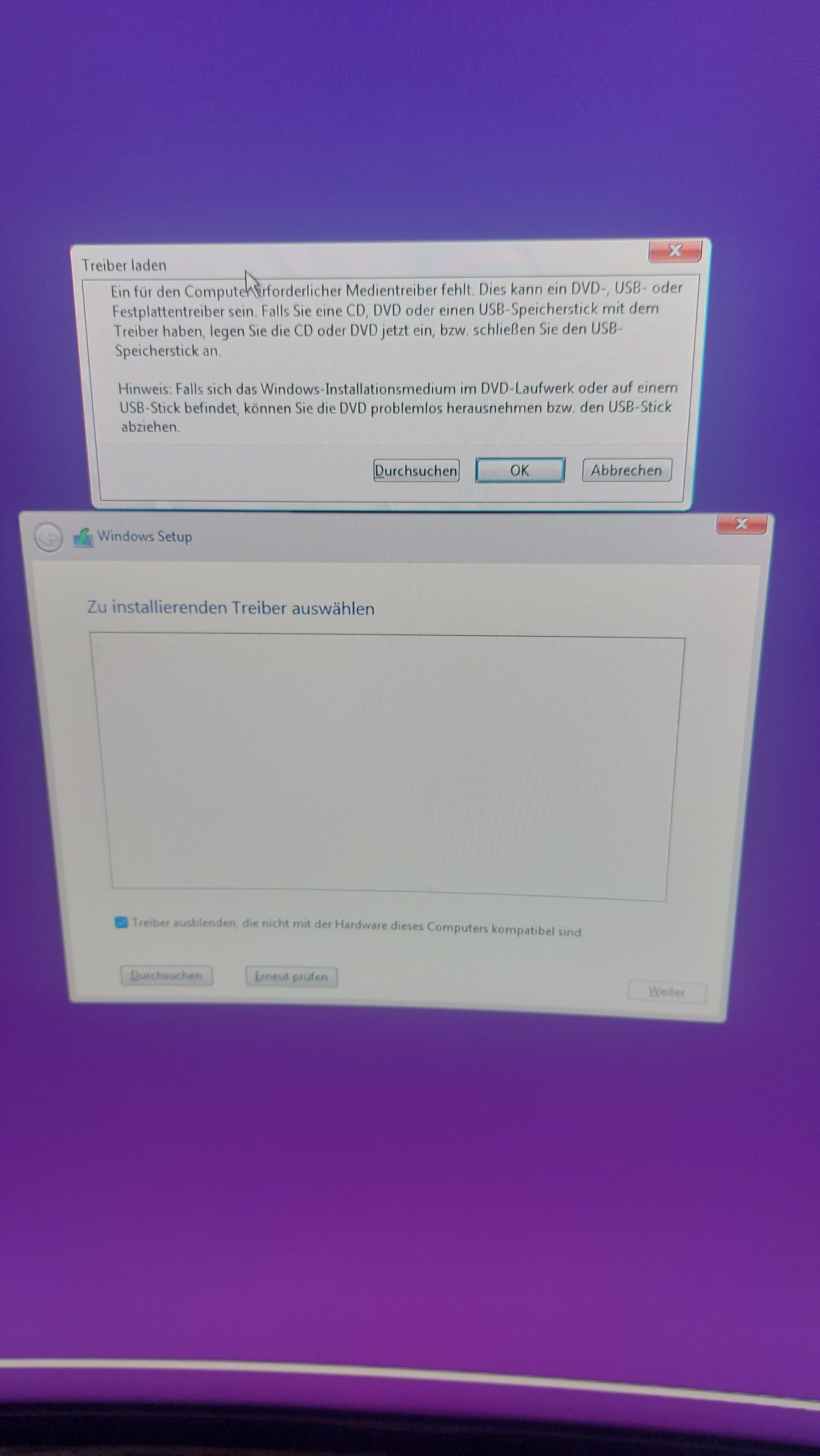Ich habe folgendes Problem und zwar habe ich an der Datenverwaltung in Windows rum gespielt und hab etwas gelöscht wahrscheinlich die Wiederherstellungs Partition.... Seit dem startet der PC direkt ins bios und findet keine device fürs booten. Ich hab nun versucht Windows neu zu installieren mit ein USB Stick aber dann kommt die Meldung das Treiber fehlen. Im BIOS wird meine ssd angezeigt aber booten tut er nicht. Kann mir jemand eventuell helfen ?