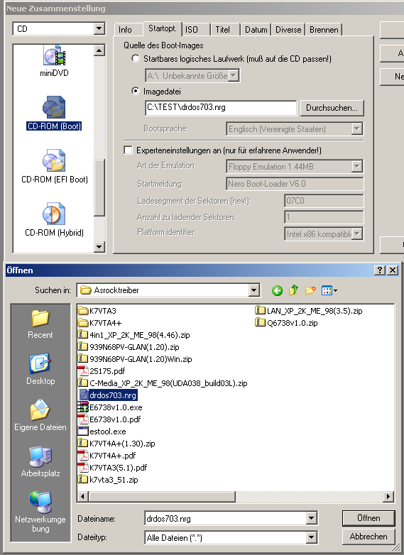Mit dem Shareware-Programm Floppy-Image habe ich ein Dos-Boot-Image einer Win-98-Diskette erstellt.