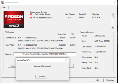 ich habe bei https://www.techpowerup.com alle 17 Bios für eine RX480 (egal welcher Hersteller und egal wie viel RAM) ausprobiert.