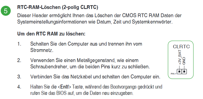 Hier die beiden Stifte unter CLRTC mußt du bei stromlosem Rechner für ein paar Sekunden elektrisch überbrücken!