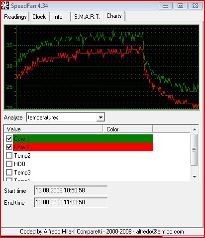 ...und eine Grafik der Temps von SpeedFan mit 15 min Prime95 danach Idle.