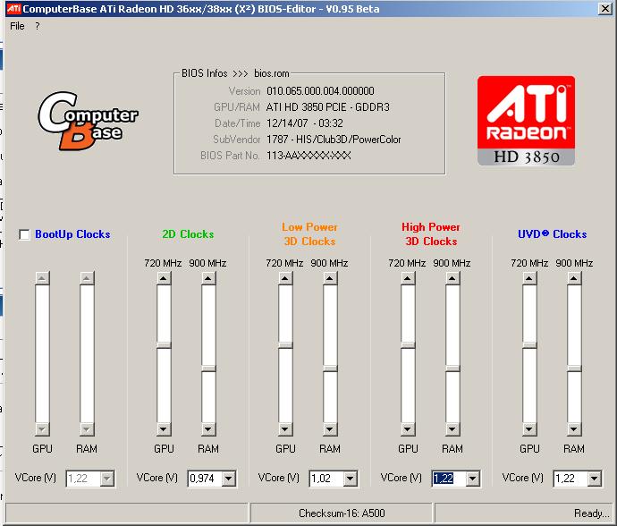 kurze frage ist es egal welche 3850 man hat ich meine vom bios her kriege gleich meine powercolour 3850 256mb waere natuerlich sehr dran interresiert auch ein bischen am bios zu feilen aber hier gibbet ja schon so ein aoder andere die schon gute werte haben.