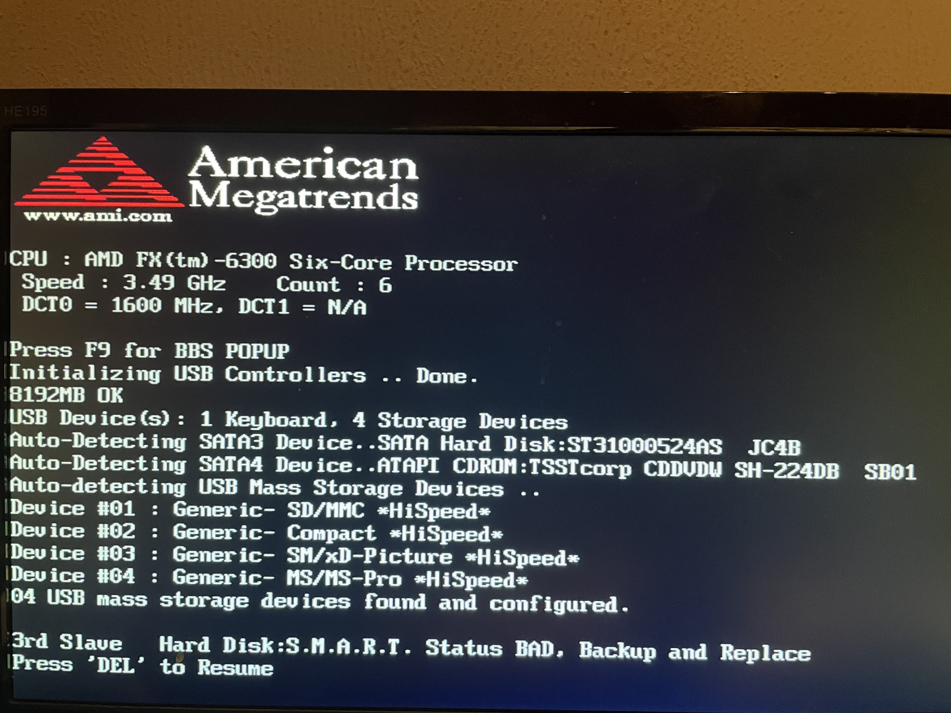 Wenn ich ihn starte gelange ich ins BIOS. Dort steht nun „Hard Disk:S.M.A.R.T. Status BAD, Backup and Replace“.