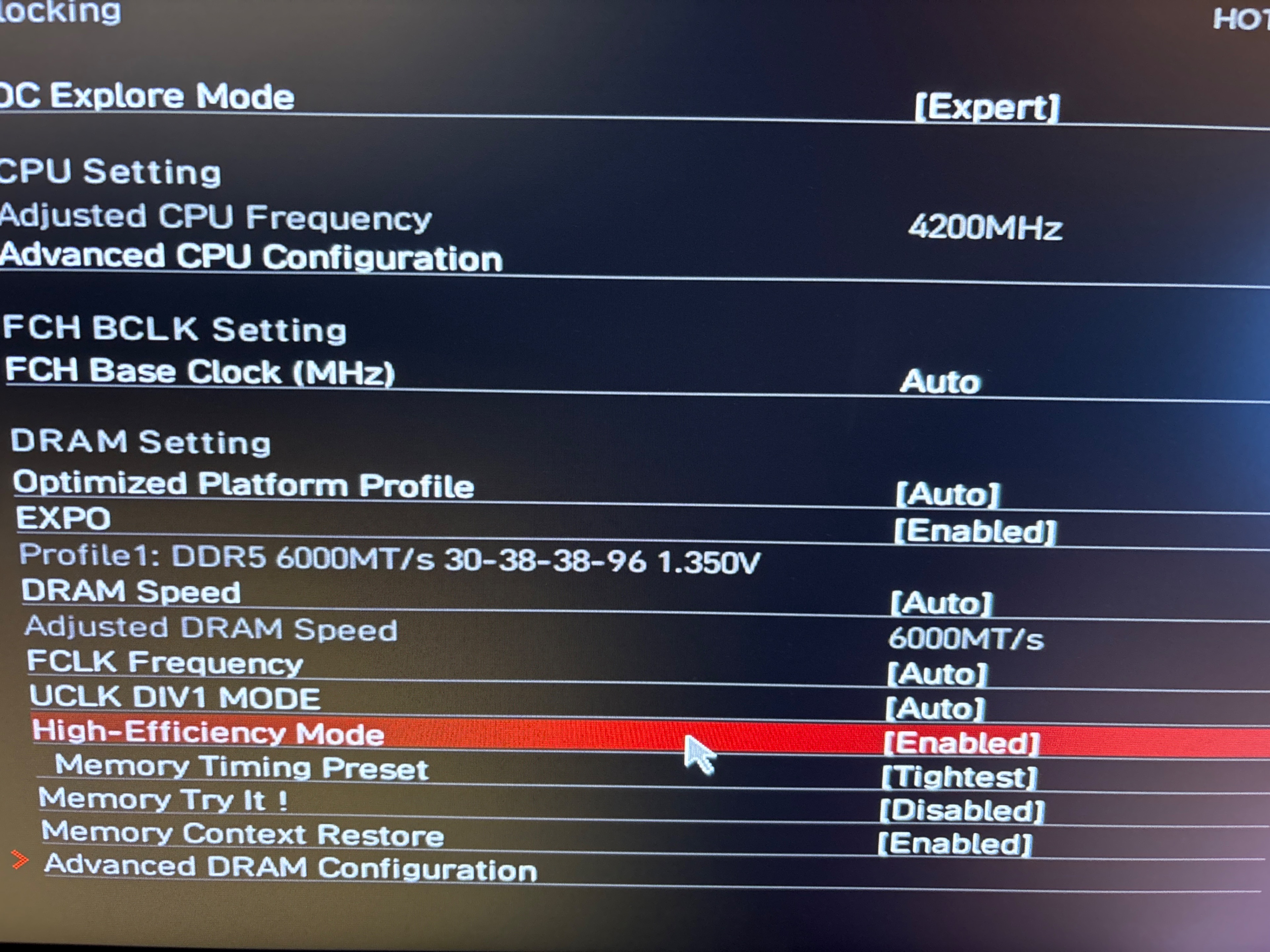 Ich wollte nämlich den High Efficiency Mode auf Enabled setzen und dann das Memory Timing Preset auf „Tightest“ stellen (Bild2)