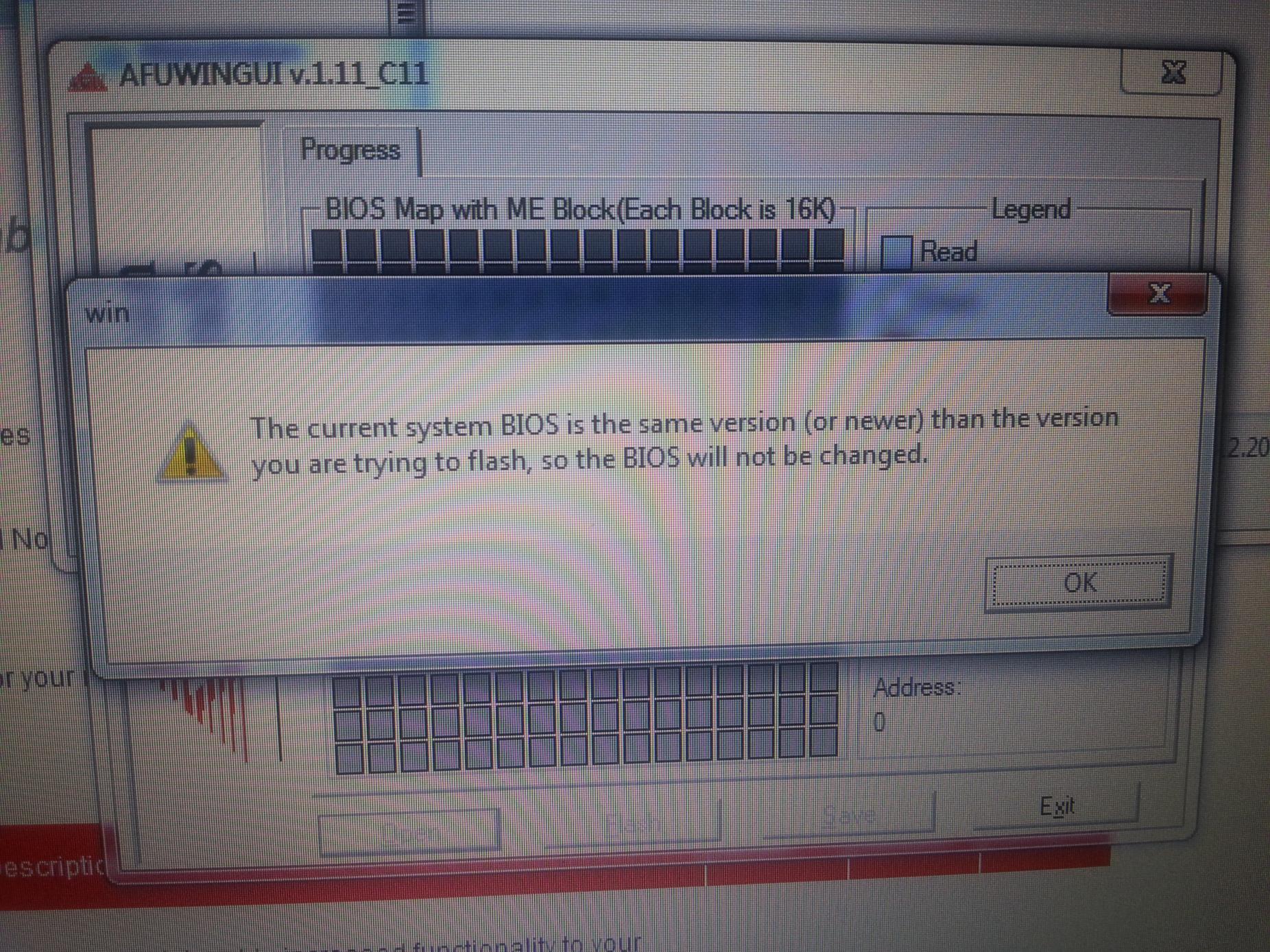 "The current system Bios is the same version (or newer) than the version you are trying to flash, so the BIOS will not be change".