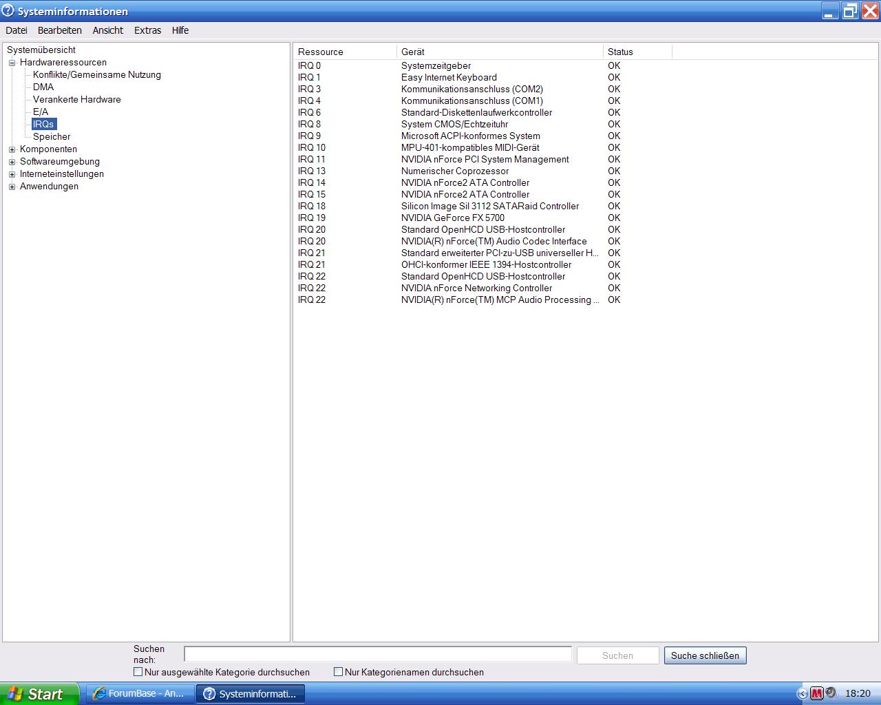 Dann sollten sich die Systeminformationen öffnen und unter Hardwareressourcen -> IRQs findest du die aktuelle IRQ-Verteilung deines Systems.