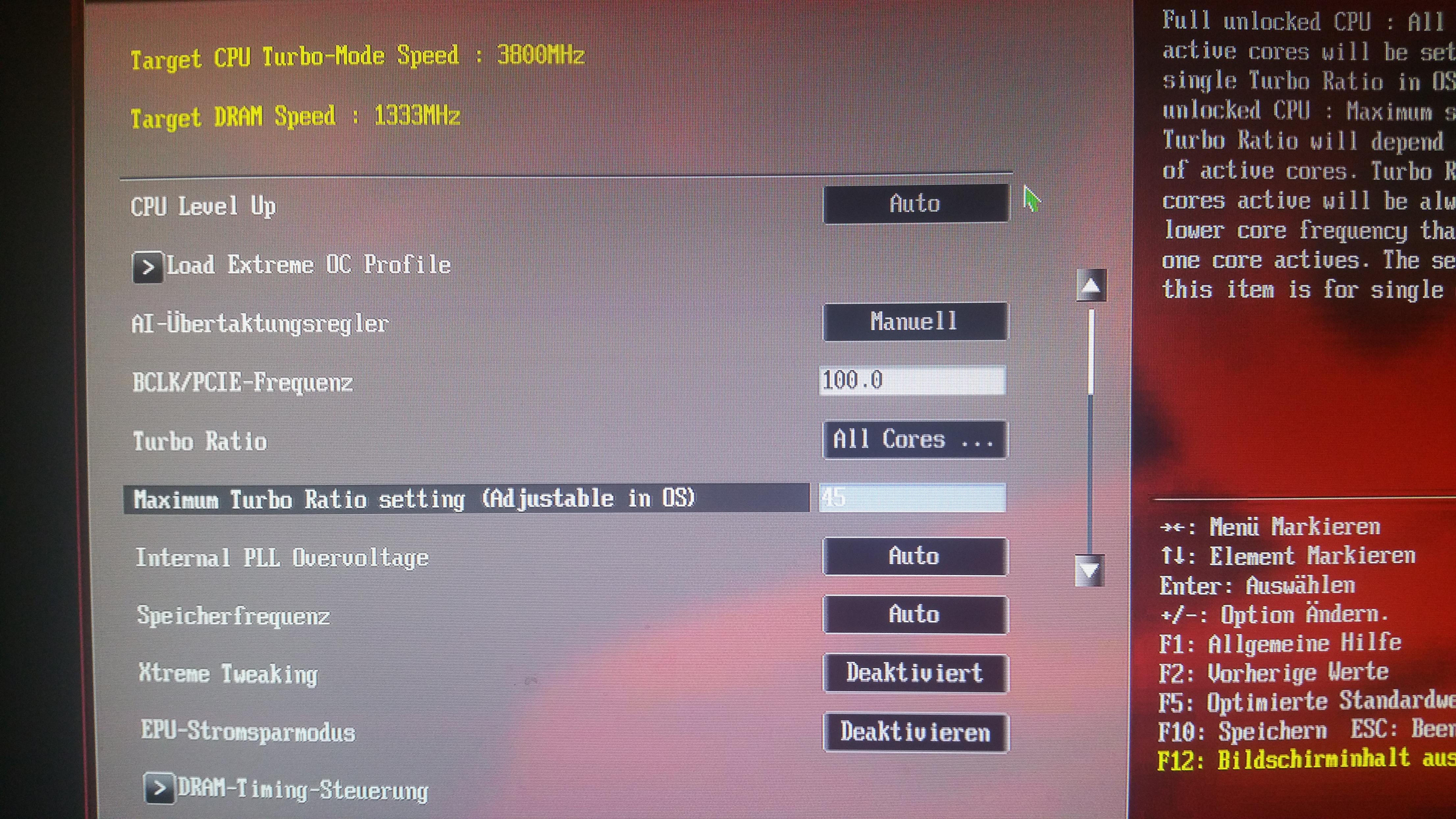 Mein Problem ist, dass ich den den Multiplikator nicht auf 45 setzen kann obwohl ich den Übertaktungsregler auf manuell stelle. Jedesmal springt der Maximum Turboratio wieder auf Auto sobald ich den Cursor wegnehme Stelle ich den Level Up auf 4,2 oder 4,6 lässt sich ein beliebiger Wert eintragen, aber das macht ja keinen Sinn, oder?