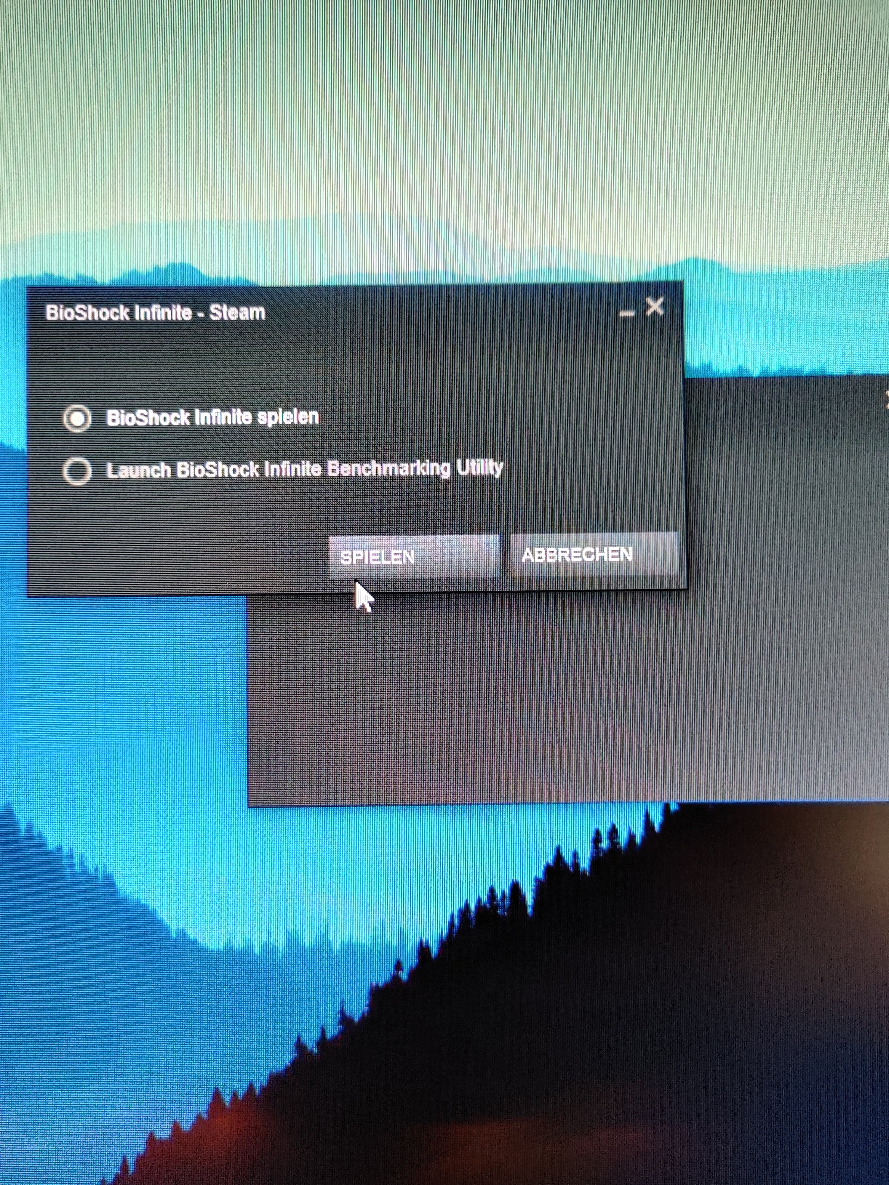 Ich habe dann auf Bioshock infinite spielen geklickt, allerdings startet das Spiel nicht. Das einzige was passiert, ist, dass ein kleines weißes Rechteck in der linken Ecke meines Monitors erscheint. (Ca. 3 Sekunden danach verschwindet es wieder). Dann erscheint wieder das Fenster in dem ich auswählen kann ob ich den Benchmark oder das Spiel starten will.