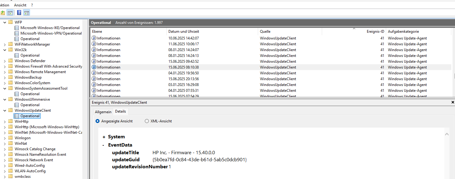 Dann habe ich die Updates im Log gecheckt. Microsoft hat das F.40 BIOS-Update trotz der beschriebenen Updateeinstellungen am 15.06.25 ohne mein aktives Zutun eingespielt. Es ist für mich vollkommen unklar, woher es stammt und ob es zum Gerät passt.