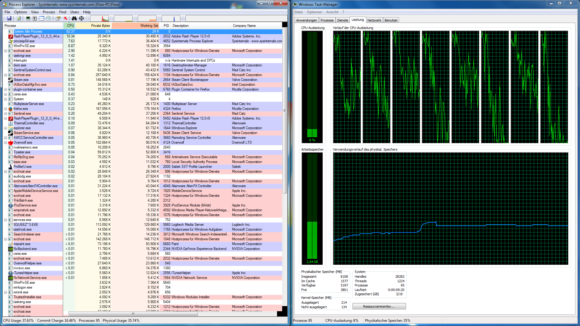 Screenshots der CPU - Auslastung unnd der PRozesse bei Leerlauf sind im Anhang