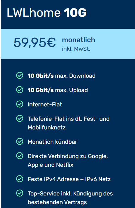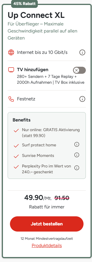 Wenn ich hier in der Schweiz eine 10 Gbit Download- und Upload-Leitung nehme, bin ich bei 49.- – und wenn man weiss, wie, gehts sogar noch günstiger für die ganzen 24 Monate.