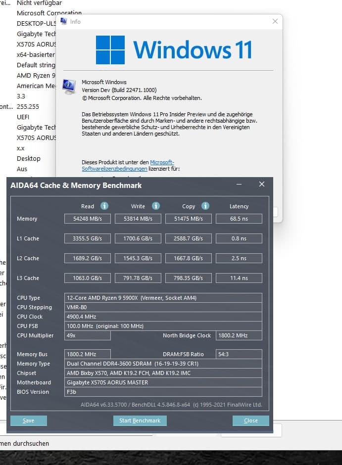 hier noch ein Screenshot (als Ergänzung) des Aida Benchmarks eines Bekannten mit 5900X und der aktuellen Windows 11 Insider Preview 22471, bezüglich des Themas L3 Cache.