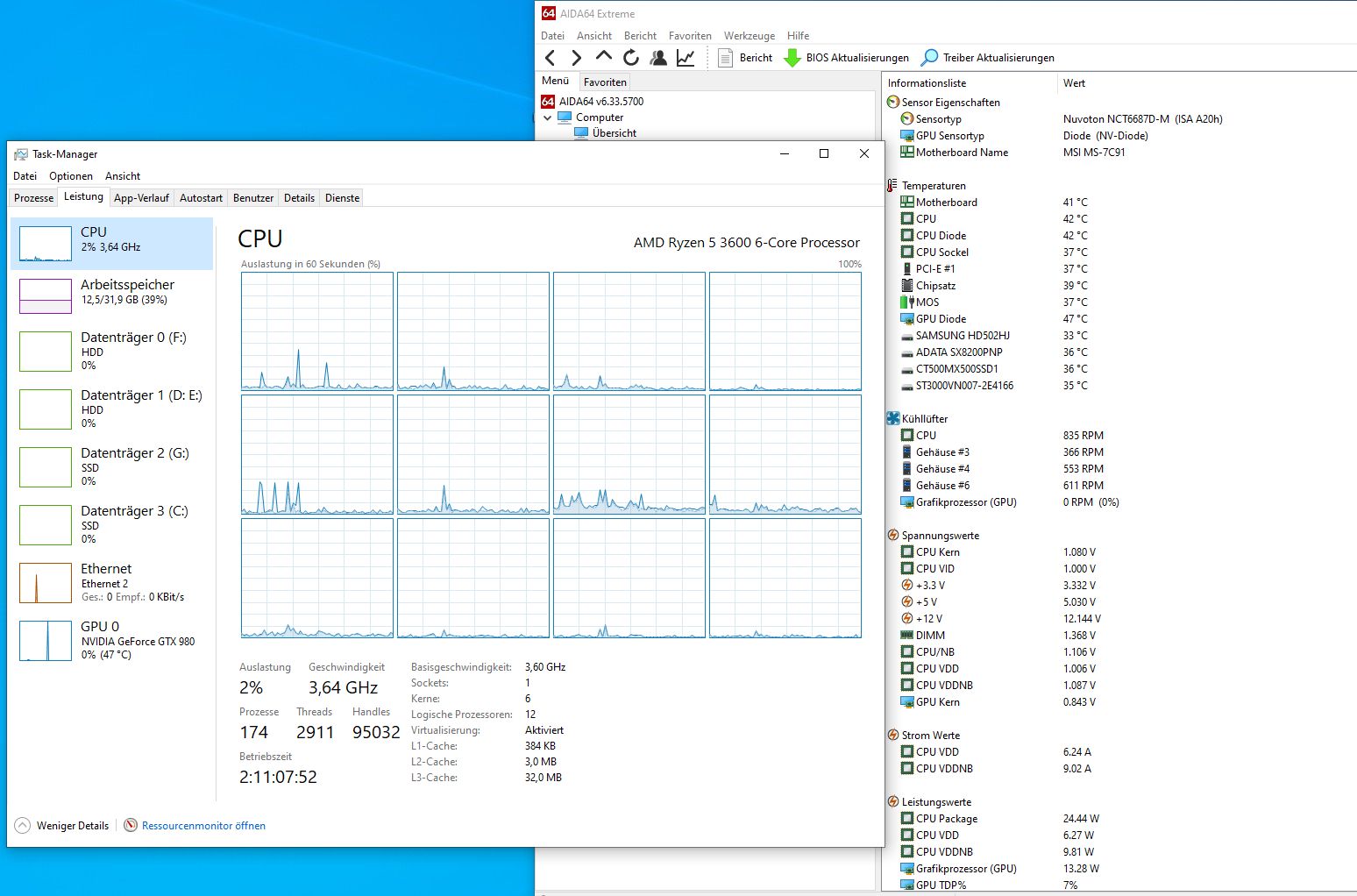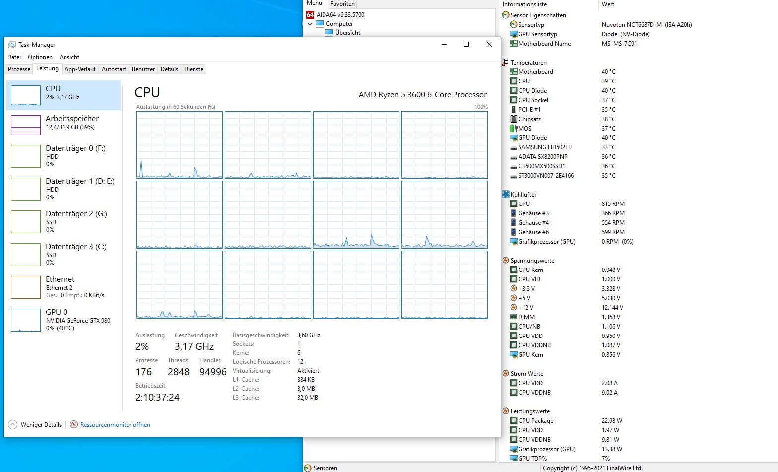 Systemlast im Idle ~2%, dabei hab ich momentan laufen: 2x Firefox 78 ESR (gesamt ca 50 Tabs), Thunderbird, Aida64, IrfanView, Taskmanager, Kaspersky IS, NetSpeedMonitor-Anzeige in der Taskbar.