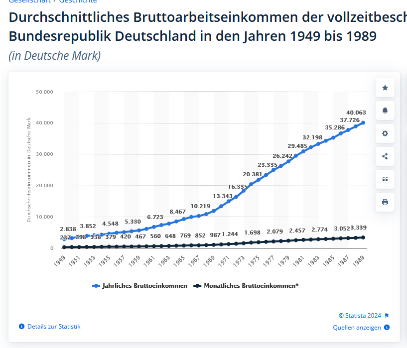Vorher wurde einem damals vom Brutto auch einfach mal aus dem Bauch geschätzt an Steuern und Sozialabgaben auch 50% weniger als heute abgenommen. Pflegeversicherung gabs garnicht. Macht wesentlich mehr Netto vom Brutto im Verhältnis zu heute. Alleine damit ist deine ~6 Monats Brottolohn für ein Auto falsch. Noch Falscher ist, dass man seinen gesamten Brottolohn für Konsum hätte, nein wenn dann den Nettolohn, nach Abgaben und Steuern.