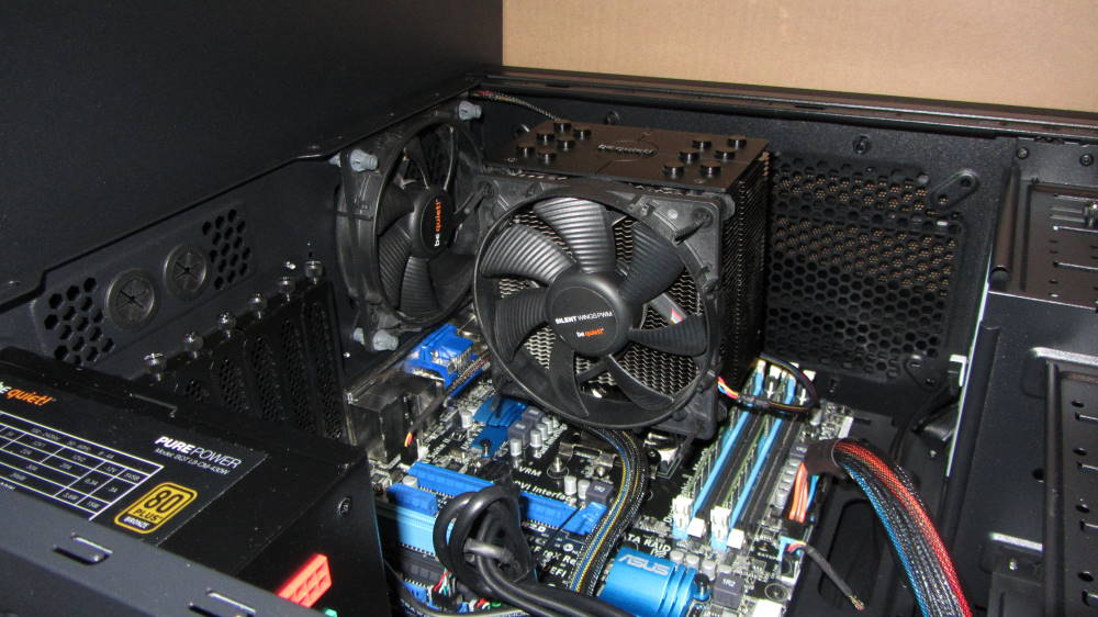 Einziges Manko ist, dass der Lüfter nur nach oben oder unten eingebaut werden kann. Ich hätte ihn gerne um 90° gedreht, dass der Luftstrom zum hinteren Lüfter ginge. Das hätte die Kühlung sicher unterstützt. Dafür ist wenigstens kein Netzteil im Weg und direkt hinter dem Lüfter, im Deckel, ist noch Platz für zwei Zusatzlüfter.