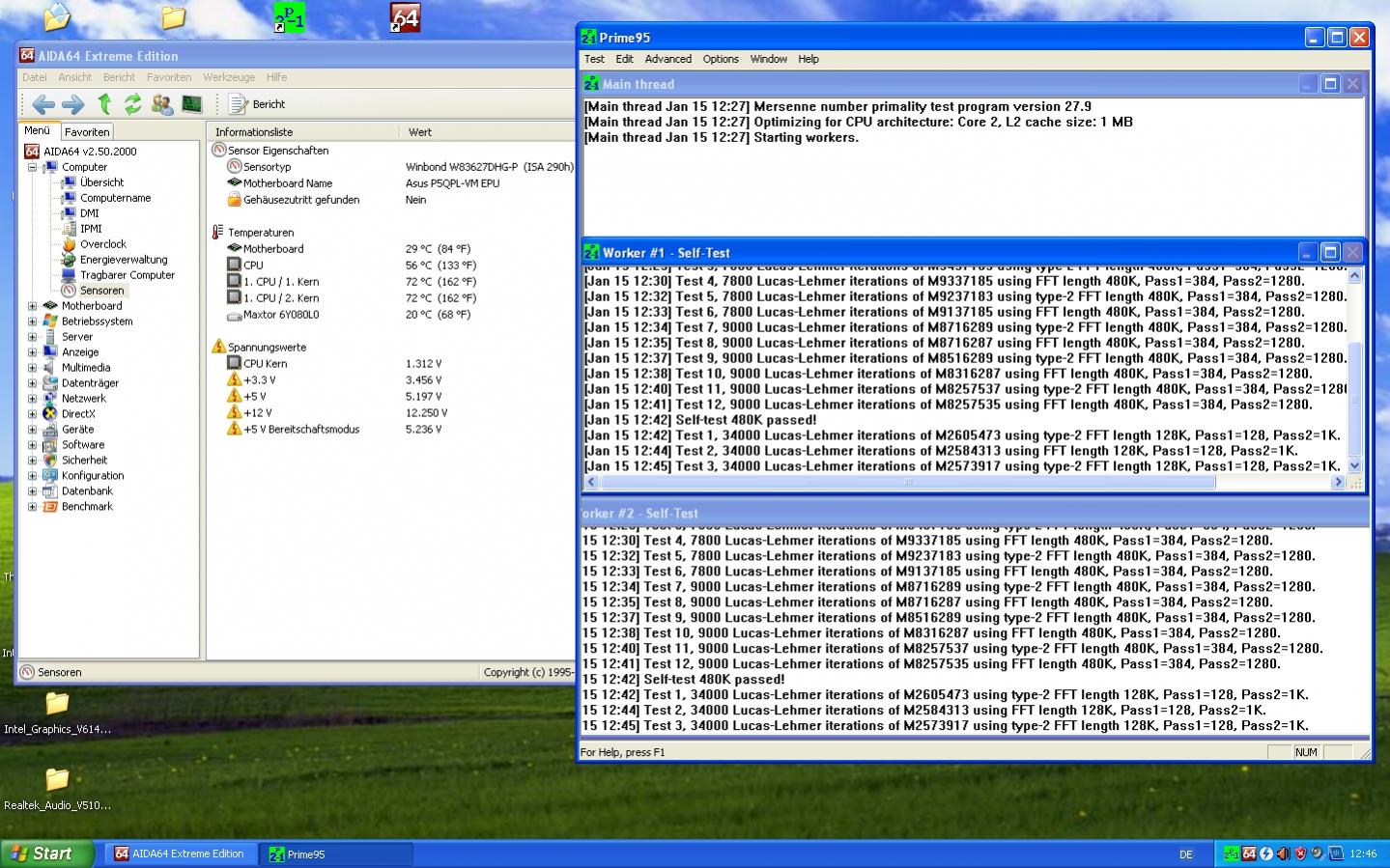 Getestet hab ich mit Windows XP und Prime95 um die abwärme zu testen. Dazu hab ich den Arctic passiv laufen lassen, Gehäuse geschlossen und dann verschiedene Screens zu den verschiedenen Drehzahlen gemacht. Das ganze ca. 40cm neben einer Heizung bei ~ 22 Grad Celsius Raumtemperatur