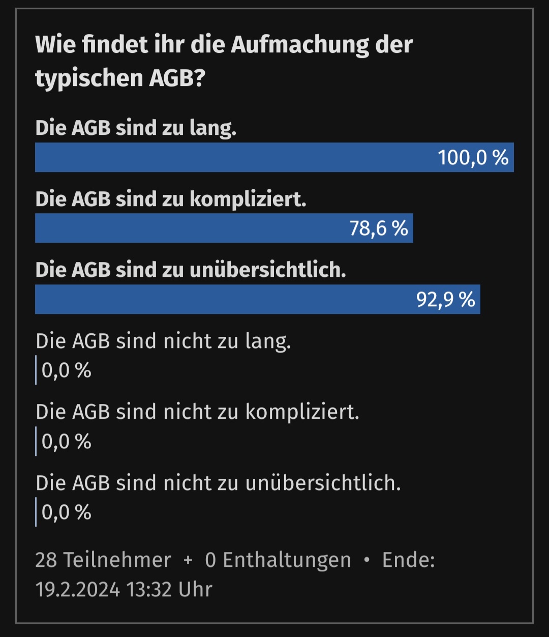 Mir kann niemand erzählen, dass er AGBs im Allgemeinen nicht zu lang findet. Nicht zu kompliziert oder zu unübersichtlich würd ich ja noch abkaufen, grad ersteres für jemanden, der ohnehin im juristischen Bereich unterwegs ist.
