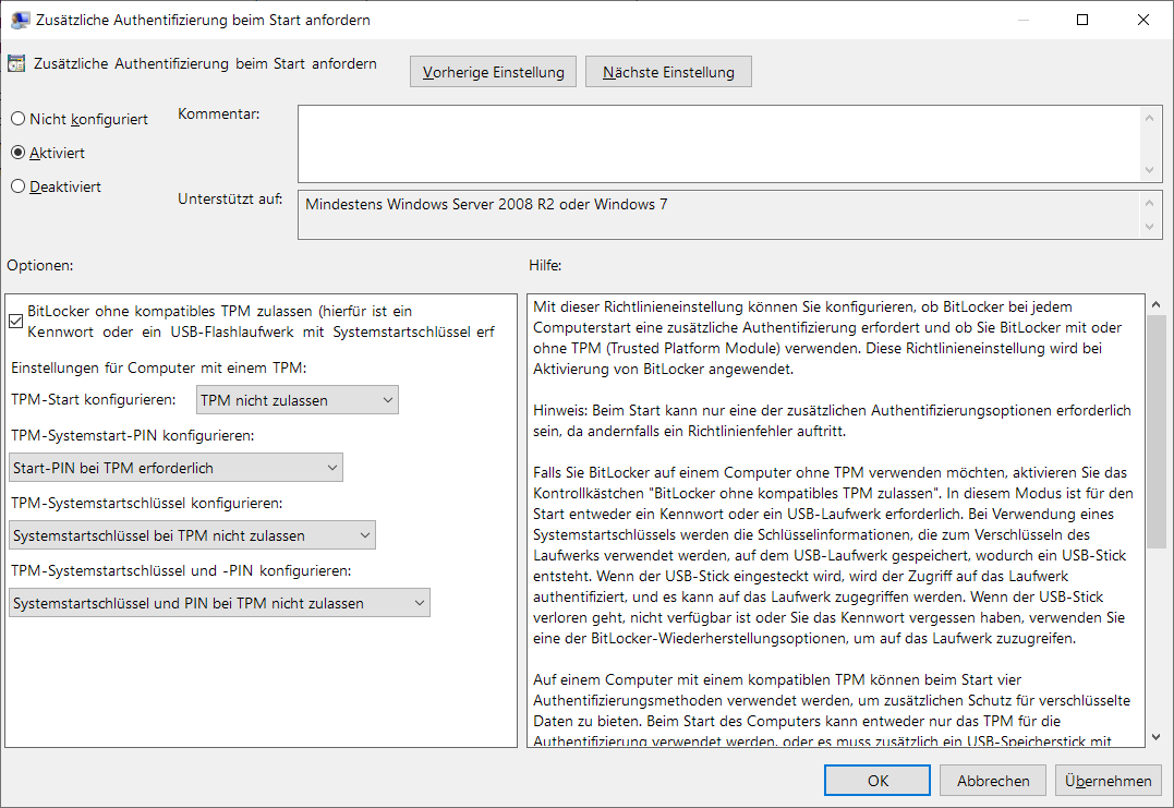 Ich hab hier einen Rechner, wo ich die Funktion "Zusätzliche Authentifizierung beim Start anfordern" aktiviert habe via gpedit.msc.