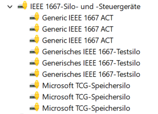 Wichtig ist, dass im Gerätemanager, wenn du "Ausgeblendete Geräte anzeigen" auswählst, die Kategorie "IEEE 1667-Silo- und Steuergeräte" vorhanden ist und dort pro SSD drei Devices vorhanden sind. In dem Fall wurde es korrekt erkannt, und dann sollte die Aktivierung der Hardwareverschlüsselung eigtl. auch funktionieren.