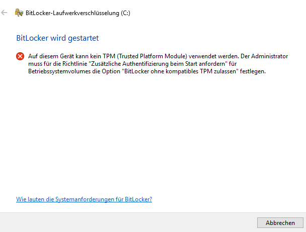Nun erhalte ich aber die Meldung, dass kein TPM-Modul gefunden wurde - siehe Screen-