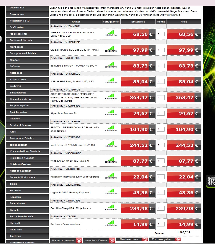 ich habe mich dazu entschlossen einen Pc zu kaufen, der genau zum Budget und meinen WÜnschen passt und habe mir da mit etwas Hilfe dieses Teil zusammengestellt.