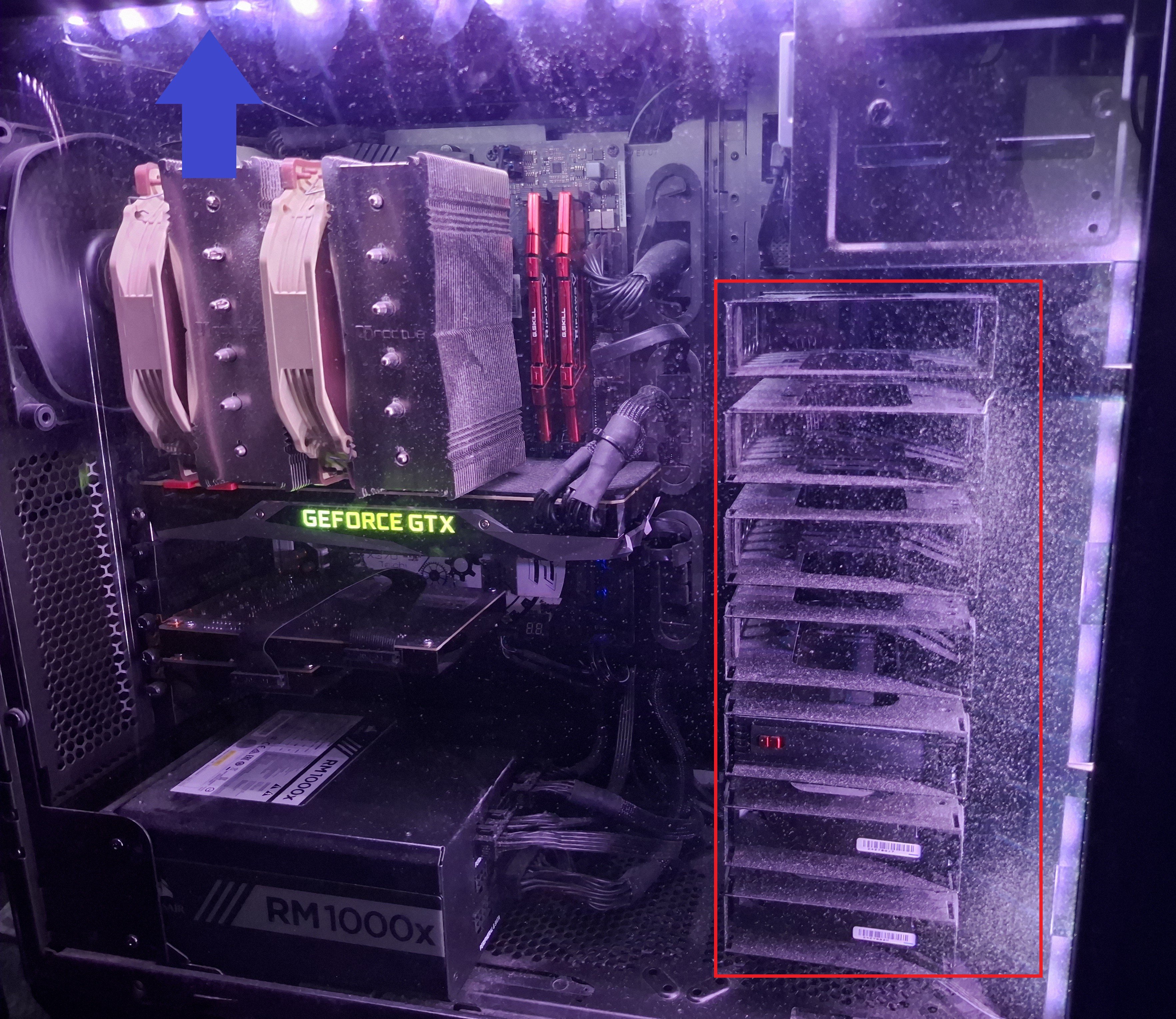 Die ganzen HDD Käfige sollte man möglichst ausbauen, um den Airflow zu verbessern, hier wäre die Frage gibts größere Datenmengen, für die noch eine HDD notwendig ist.