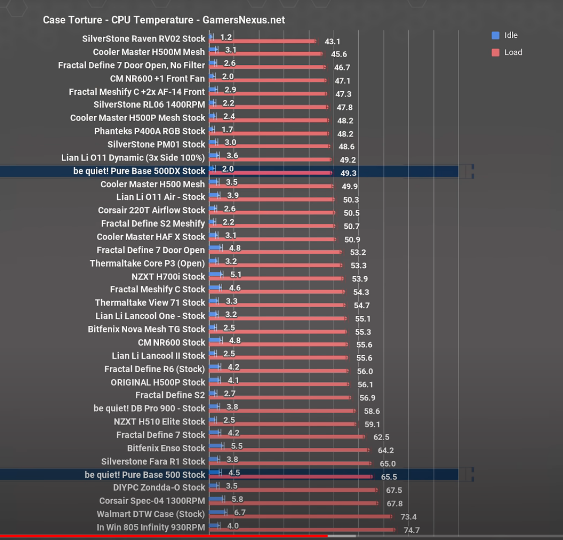Die CPU ist beim 500DX ist im "Case Torture" bei Gamersnexus etwa 15°C kühler als beim PB 500, obwohl ersteres noch nicht mal zu den besten Airflowgehäusen gehört. Von "top Werten und Temperaturen" kann da keine Rede sein.DigitalBlizzard schrieb:also das mit dem schlechten Airflow ist nicht der Fall beim PureBase, habe es selbst , top Werte und Temperaturen, man kann natürlich das DX nehmen oder jedes andere.