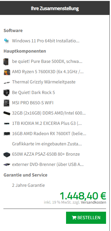 Ich habe mir dann folgenden PC bestellt - bei PCSPECIALIST.de: