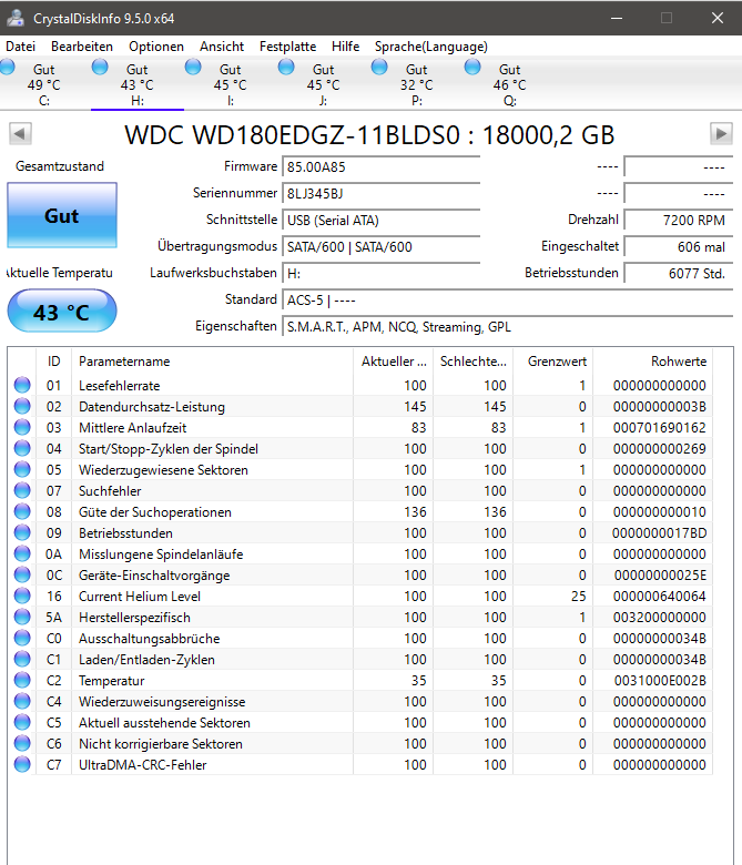 Die Frage ist jetzt natürlich, was ist zu tun mit der teuren Hardware dieser Drives? CrystalDiscInfo zeigt nach diesen Rettungsaktionen weder bei H noch bei I Probleme an (ich kenne mich allerdings mit den Details dieser Werte nicht aus). Ich habe hier im Anhang von beiden Platten ein Screenshot der Smart-Werte beigefügt. (Die Hersteller - Analysesoftware von WD ist leider großer Mist und wie ich bei Reddit erfahren konnte, kann WD Drive Utilities die großen Festplatten von WD über 14 TB selbst nicht erkennen und diagnostizieren.)