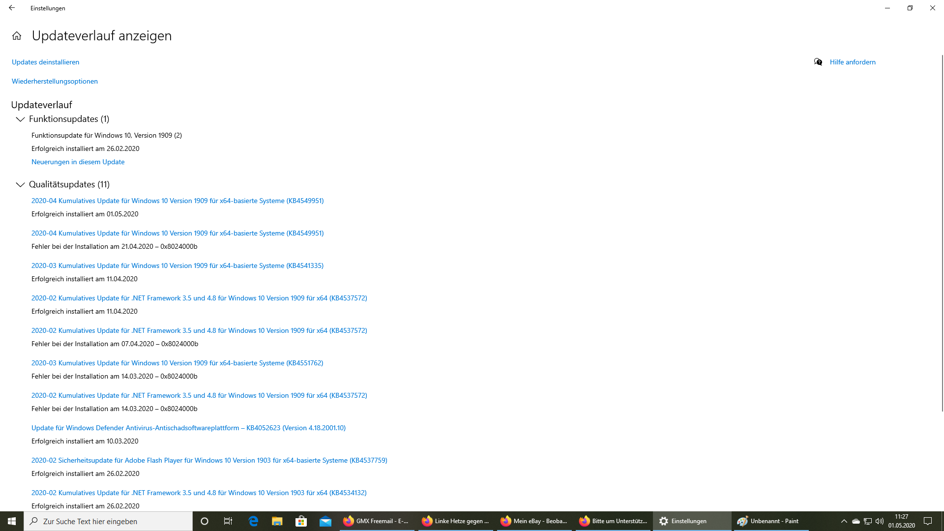(Wenn ich es zudem richtig beobachtet habe, wurden zunächst zwei andere Updates installiert, offenbar den Windows Defender betreffend, die jedoch offenbar im Updateverlauf nicht aufgeführt sind.)