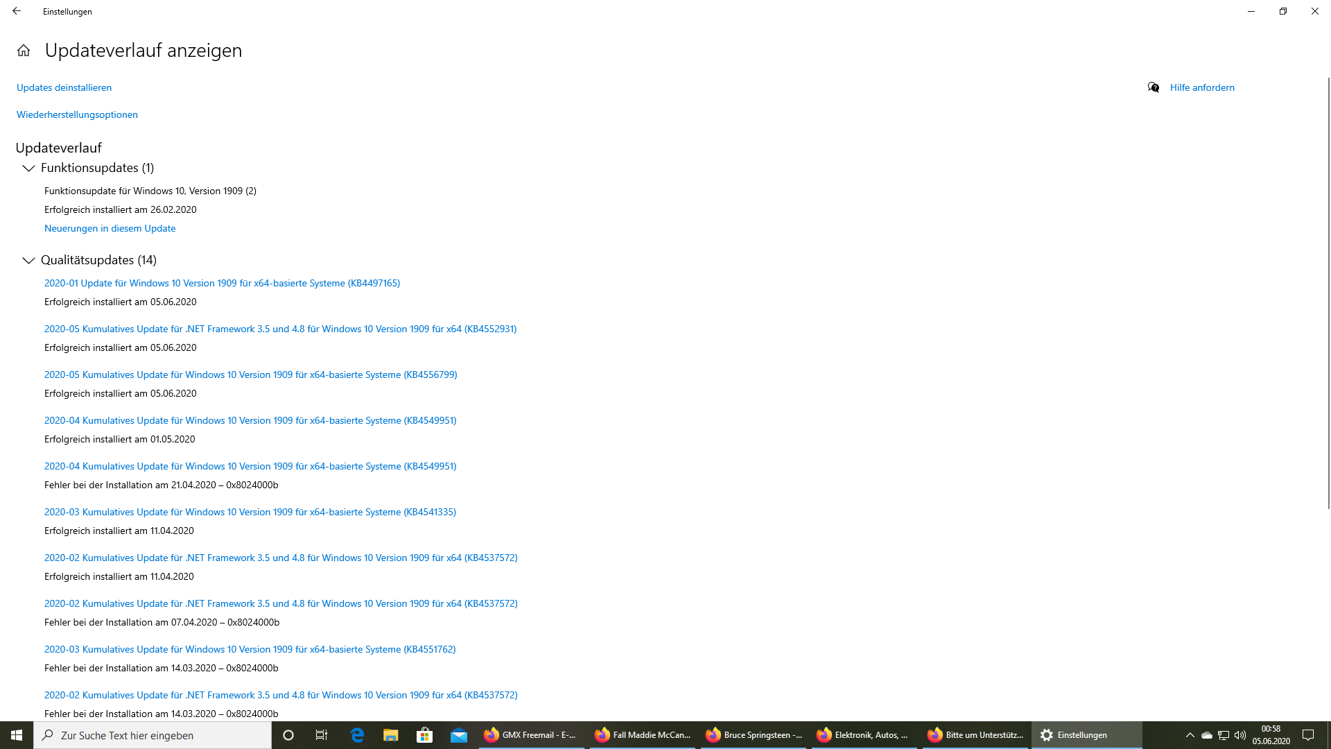 Nachdem ich die Win10-Updates auch in den letzten Wochen immer wieder verschob, ging das zuletzt nicht mehr, also ein weiteres Aufschieben um 7 Tage war nicht mehr möglich. (Das ist meines Wissens ein Merkmal von Win10; also dass man, anders als noch unter Win7, unter Win10 Updates allenfalls nur verschieben, jedoch nicht verhindern kann.) Laut diesem Stand würden die Updates am 5.06.2020 sowieso fortgesetzt, also schaltete ich die Updates (kurz vor Mitternacht, also noch am 4.06.2020) soeben halt gleich mal selber ein, vorher erstellte ich aber zur Sicherheit noch manuell einen Systemwiederherstellungspunkt.