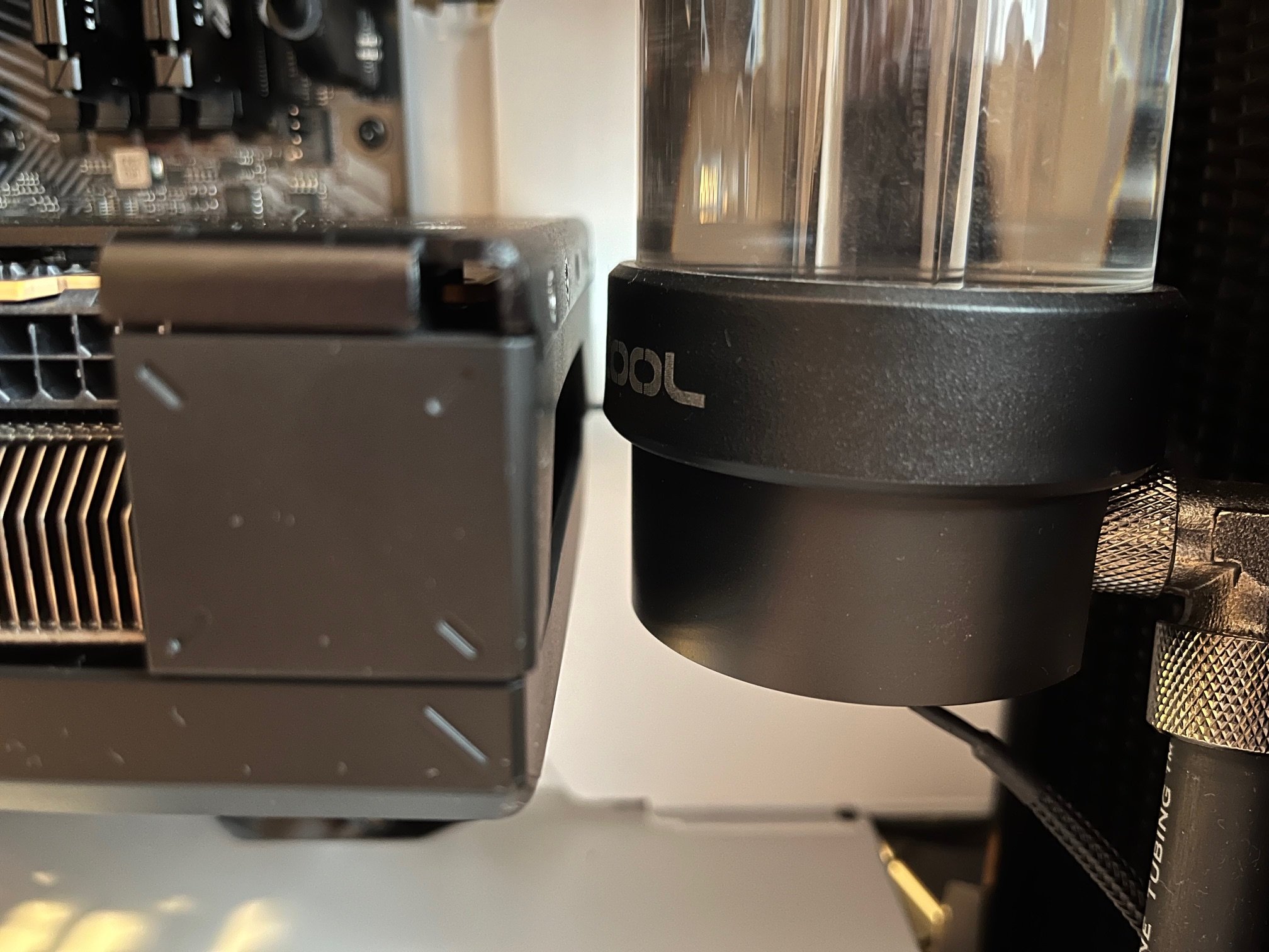 CPU-Kühler hat nicht gepasst, weil es für den Alphacool XP keine Halterungen für AM5 gibt, aber zumindest ist die neue Serie wieder sehr hochwertig aus Kupfer gefertigt, schwer und groß wie ein Eisberg.