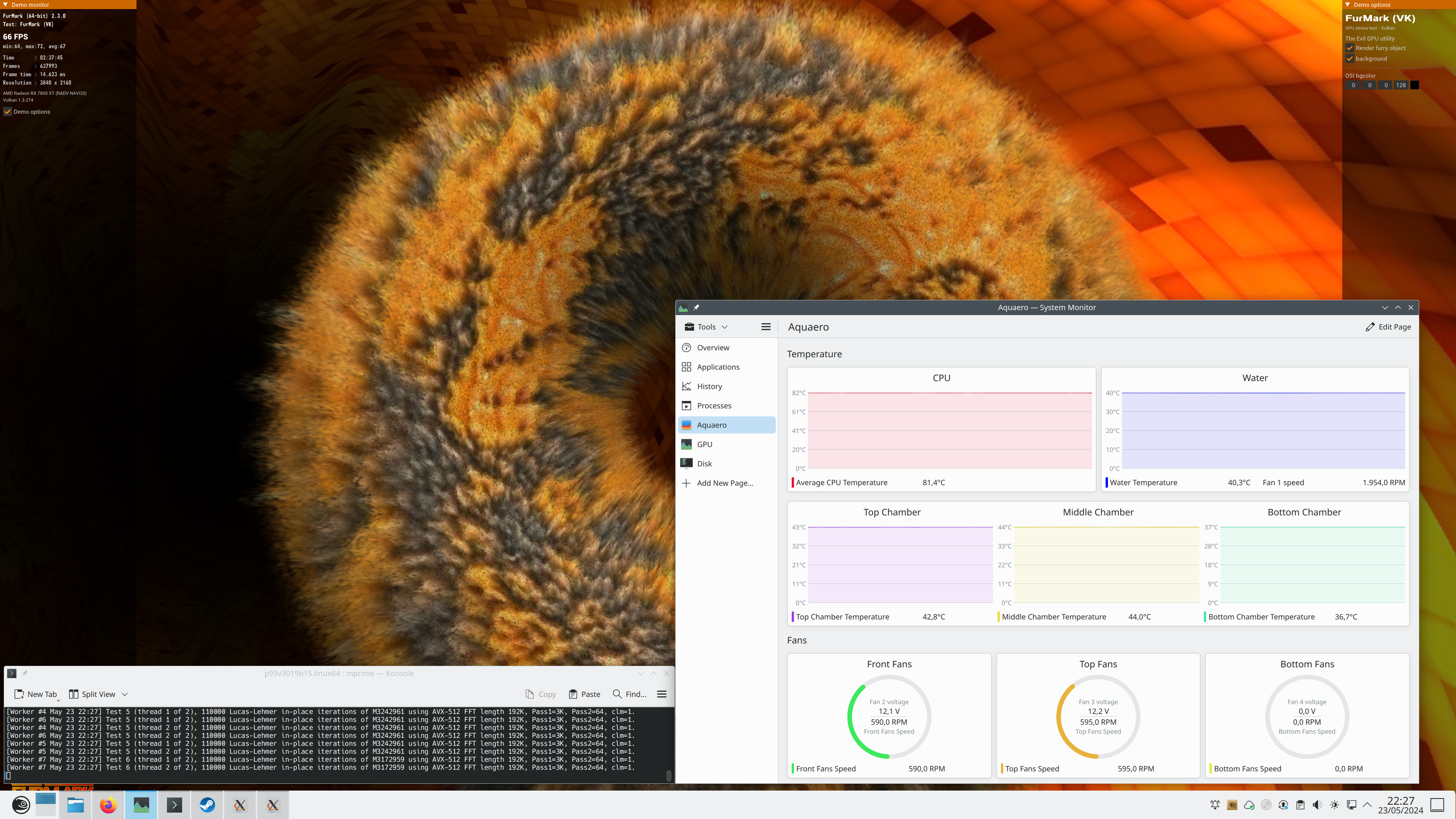 Die Temperaturen sind bei voller Auslastung der CPU bei ungefähr: CPU (71 °C), Wasser (35 °C). Mit zusätzlicher voller Auslastung der GPU beträgt die CPU-Temperatur ca. 10 Grad mehr (81 °C) und die Wassertemperatur etwas mehr als 40 °C, hier drehen die Lüfter auch gern mal auf 600 RPM hoch. Im Idle sind die Lüfter bei 200-300 RPM. Die ideale Lüfterkurve habe ich bisher nicht herausgefunden, aber mir ist eher die Lautstärke wichtig, nicht wie heiß der PC wird.