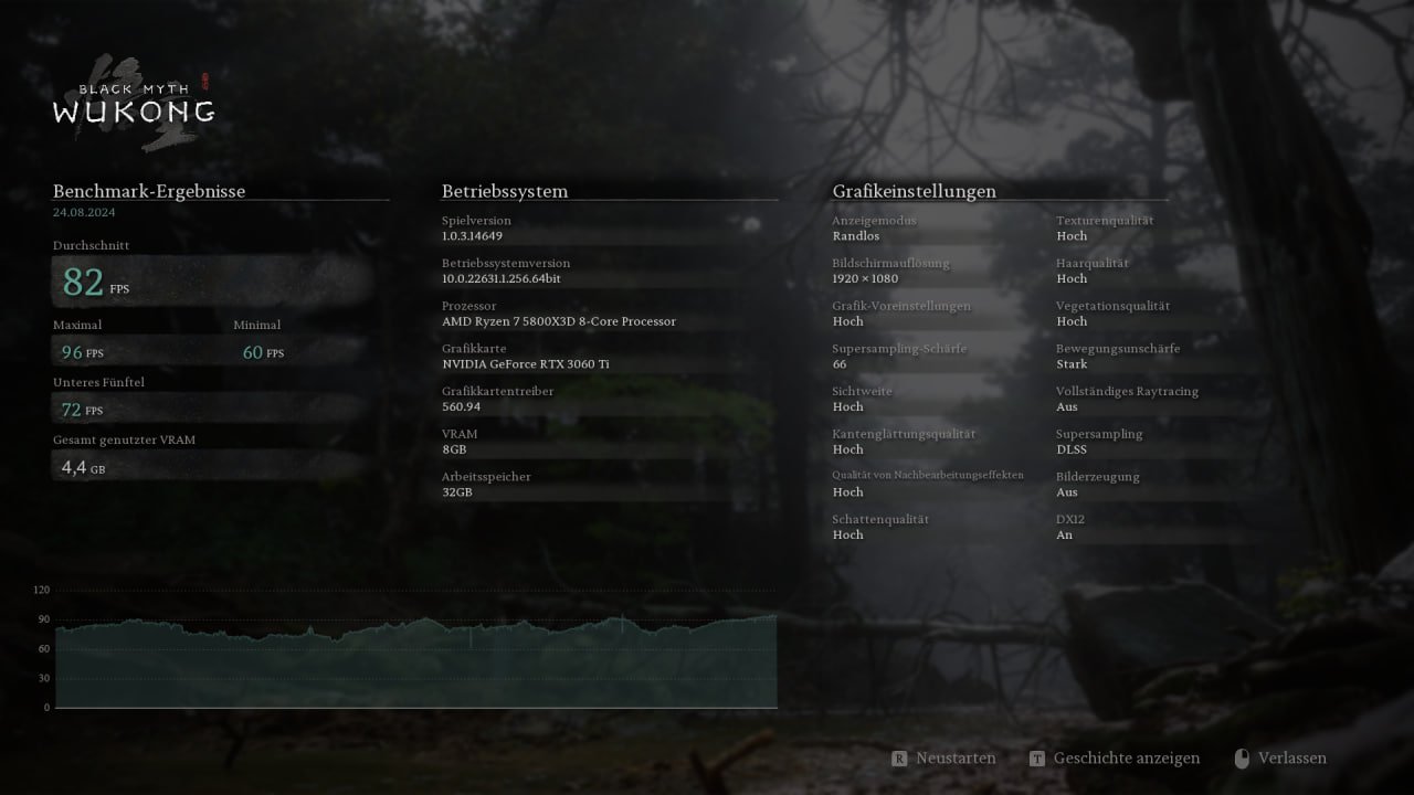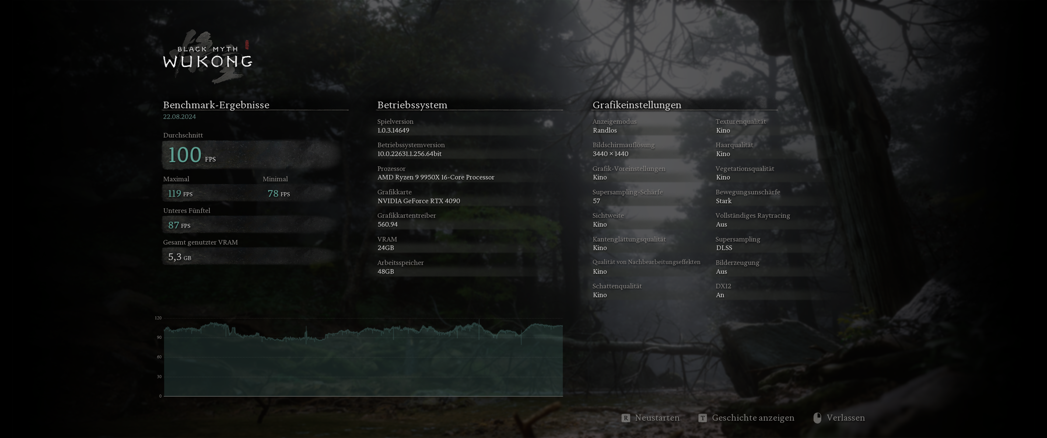 Black Myth: Wukong – 3.840 × 2.160, „Kino“ + PT Ultra, Upscaling 50 + FG: 20
