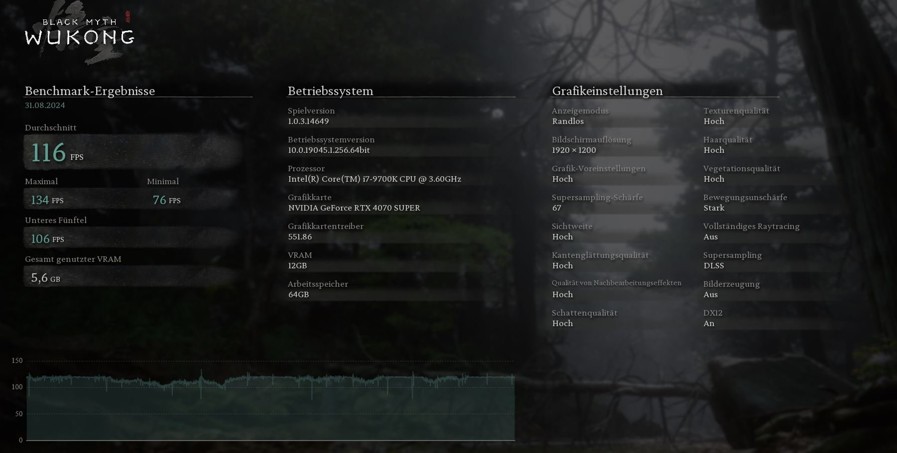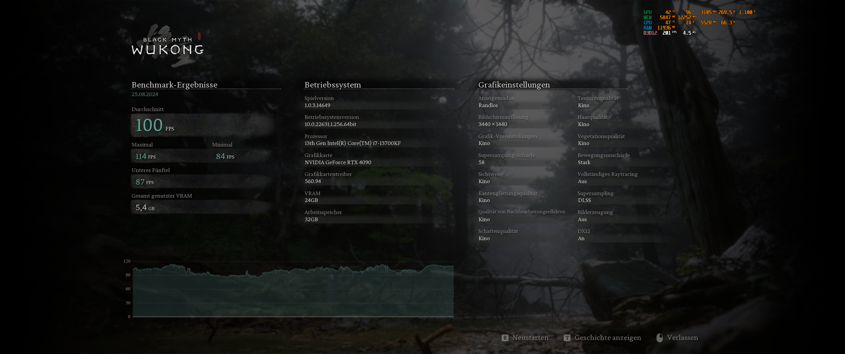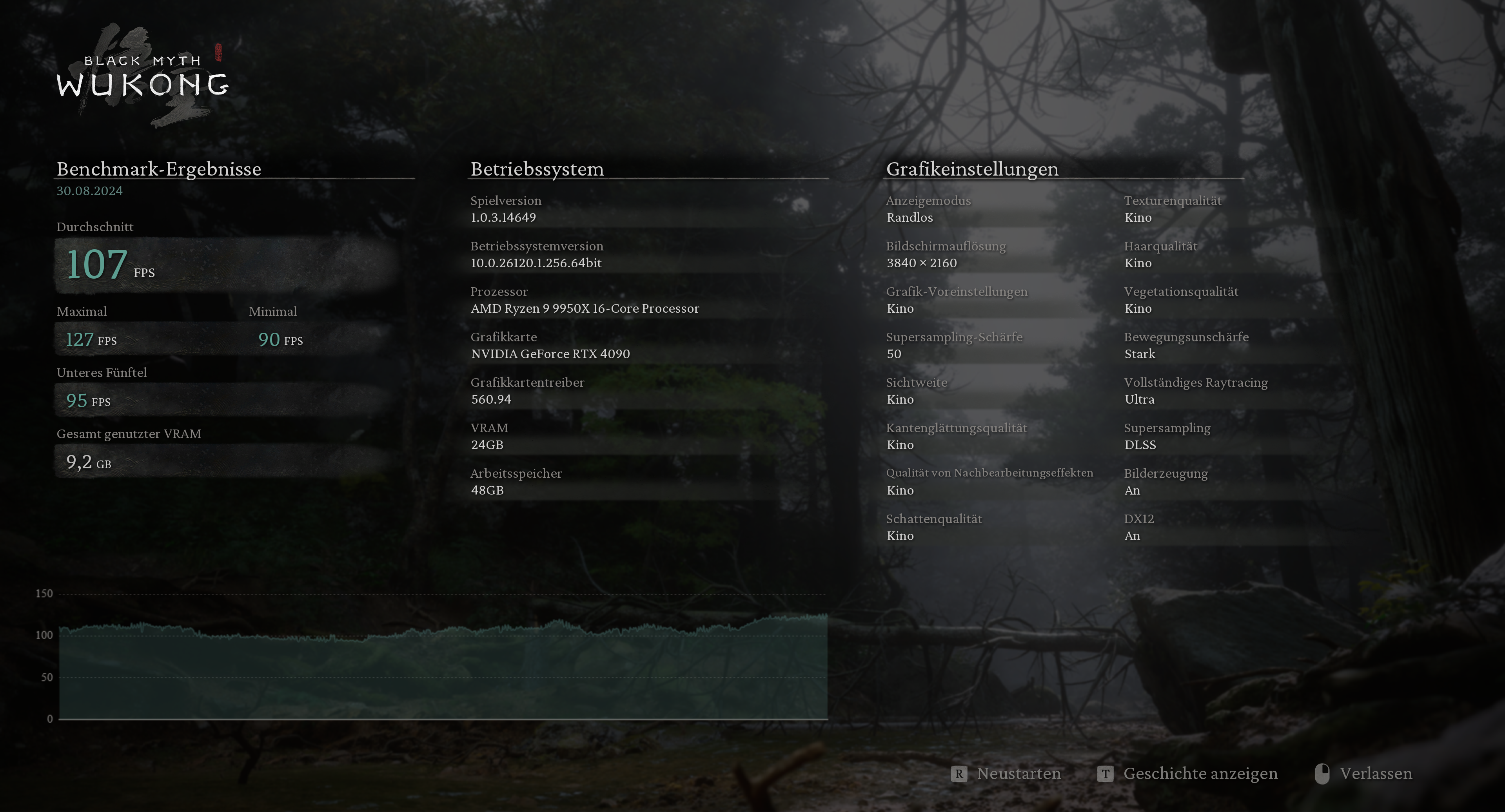 Black Myth: Wukong – 3.840 × 2.160, „Kino“ + PT Ultra, Upscaling 50 + FG: 104