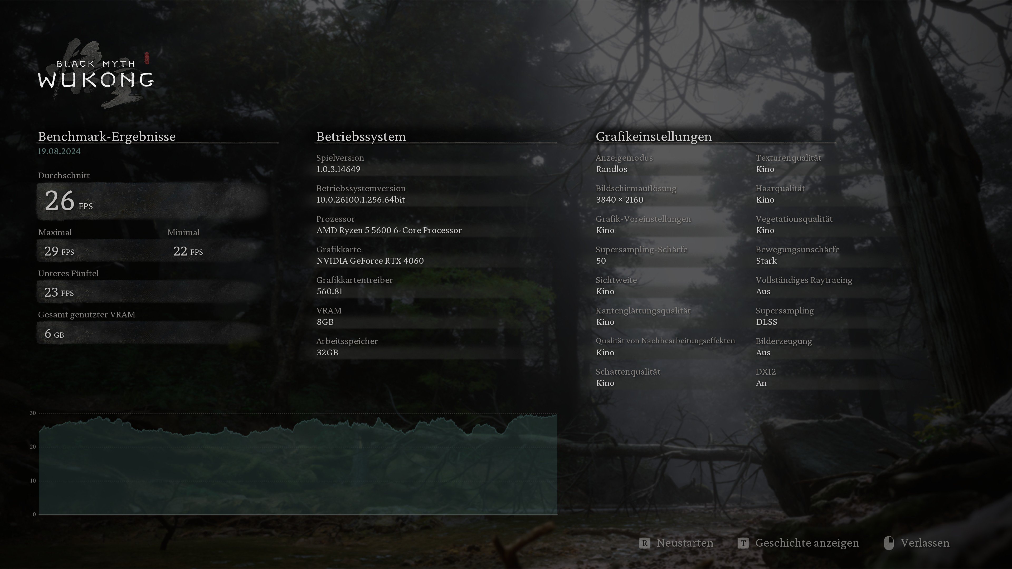 Black Myth: Wukong – 3.840 × 2.160, „Kino“ + PT Ultra, Upscaling 50 + FG: 104