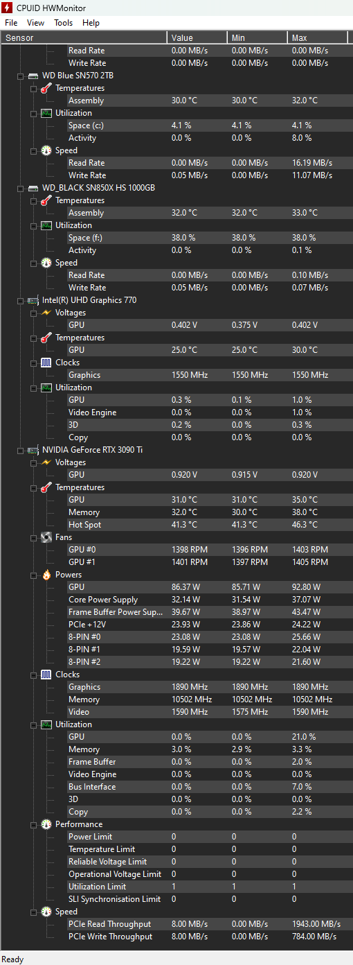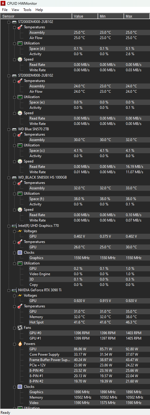 - HDD / SSD: Seagate BarraCuda 256 MB Cache, 6 Gbit/s, 2 TB (x2) + M.2 WD Blue SN570 2 TB (System), M.2 WD Black SN850X 1 TB